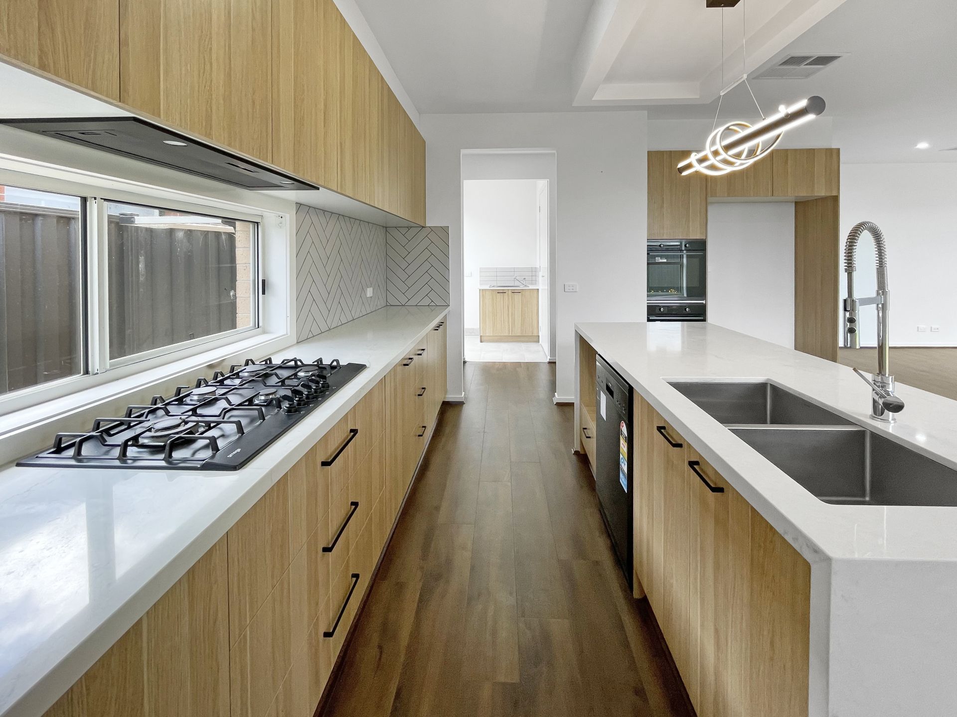 The stunning, fully equipped kitchen is the heart of the home, featuring a gas cooktop, dishwasher, soft-touch cupboards and drawers, and an essential walk-in pantry for outstanding storage.