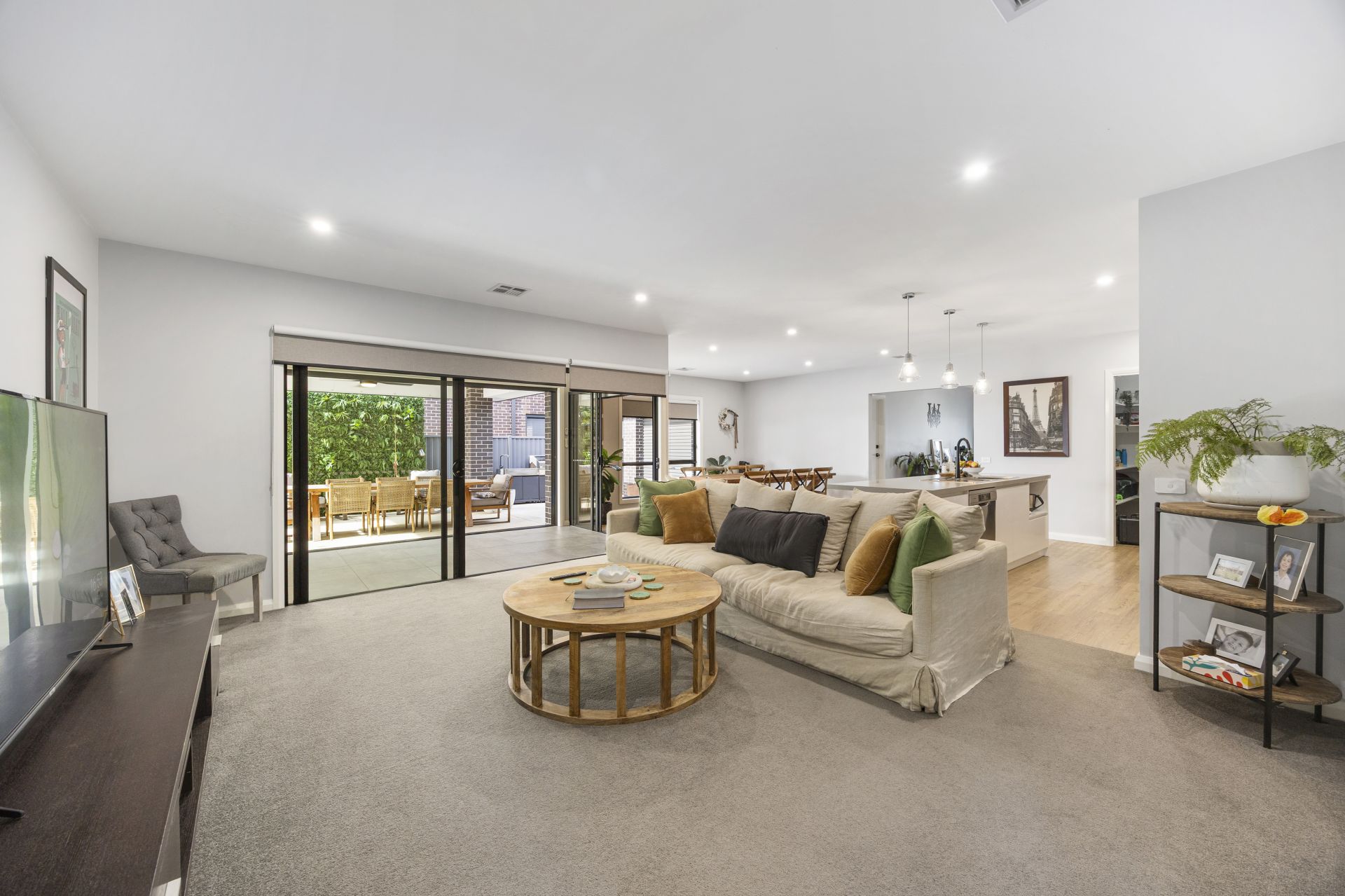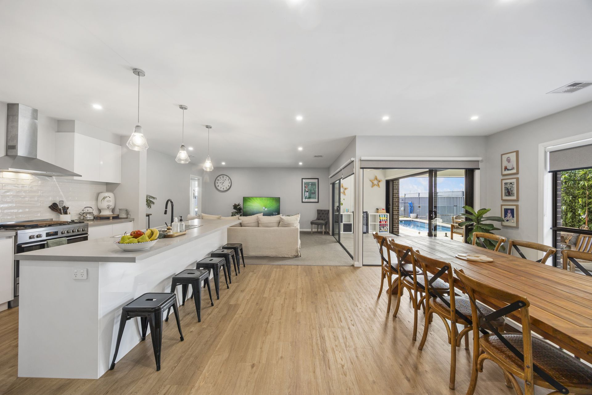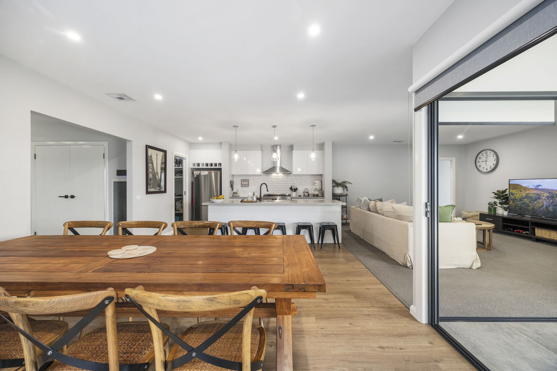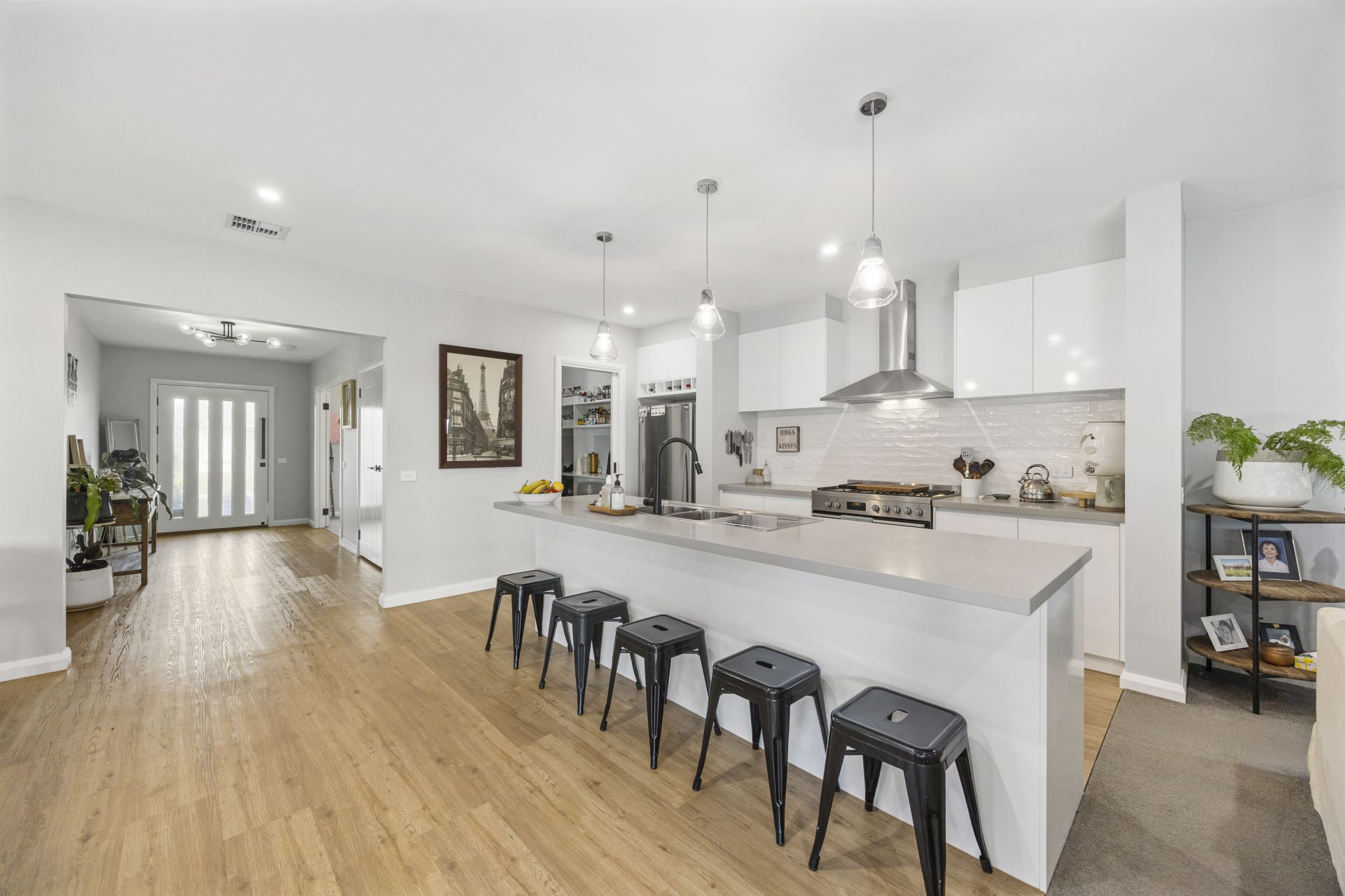 Step through the wide entrance hallway and into the light-filled open-plan kitchen, meals, and living zone - the true heart of the home. The designer kitchen features sleek stone benchtops, quality Westinghouse appliances (including a 900mm oven and dishwasher), and a spacious walk-in pantry - ideal for everyday living and entertaining alike.