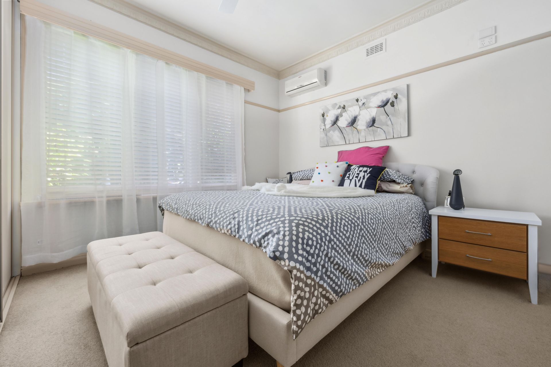 The bedrooms are thoughtfully designed with built-in robes, providing both practicality and organization. Ceiling fans throughout ensure comfort in every season, while split systems and a cozy log fire enhance year-round climate control.