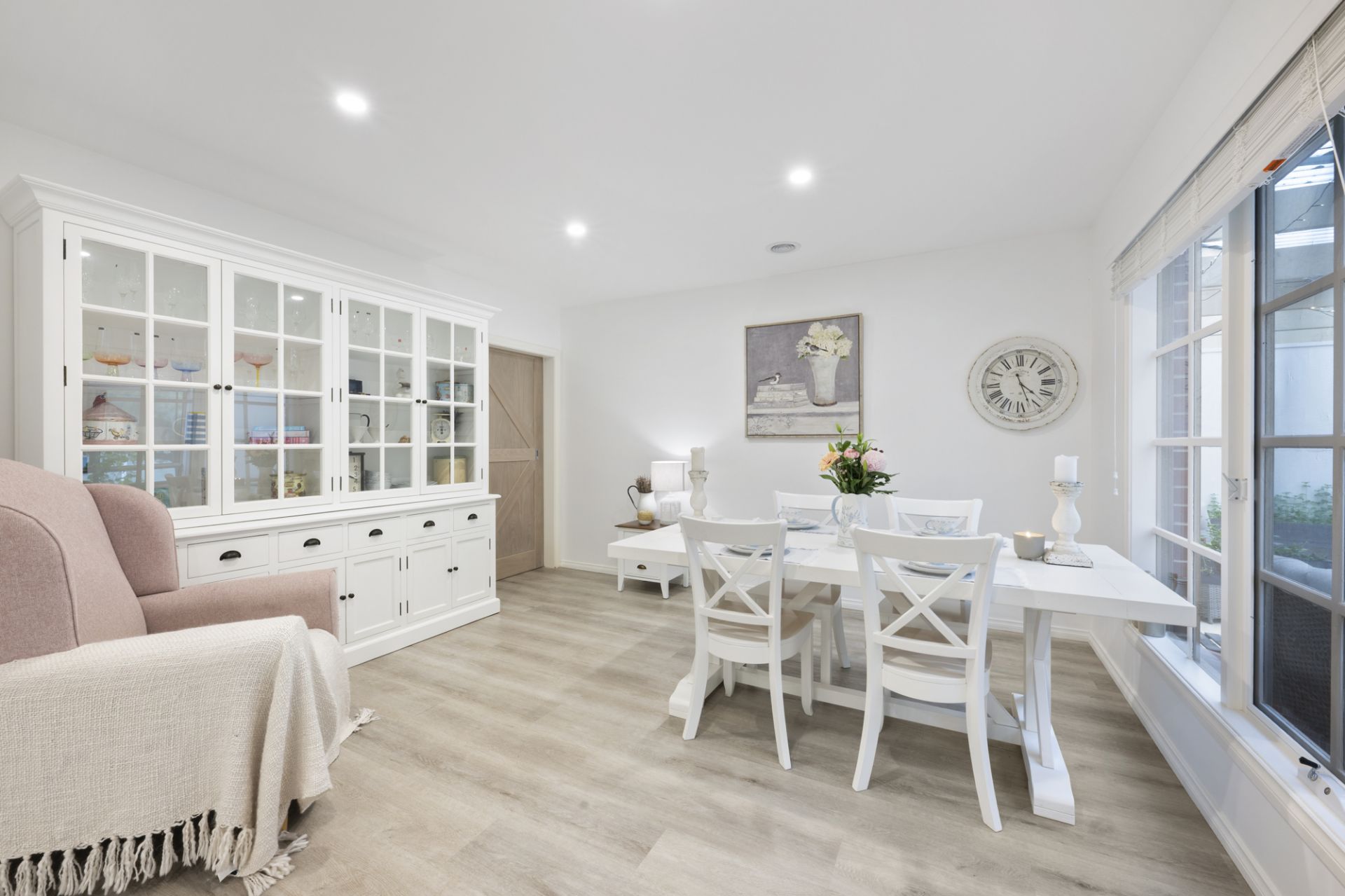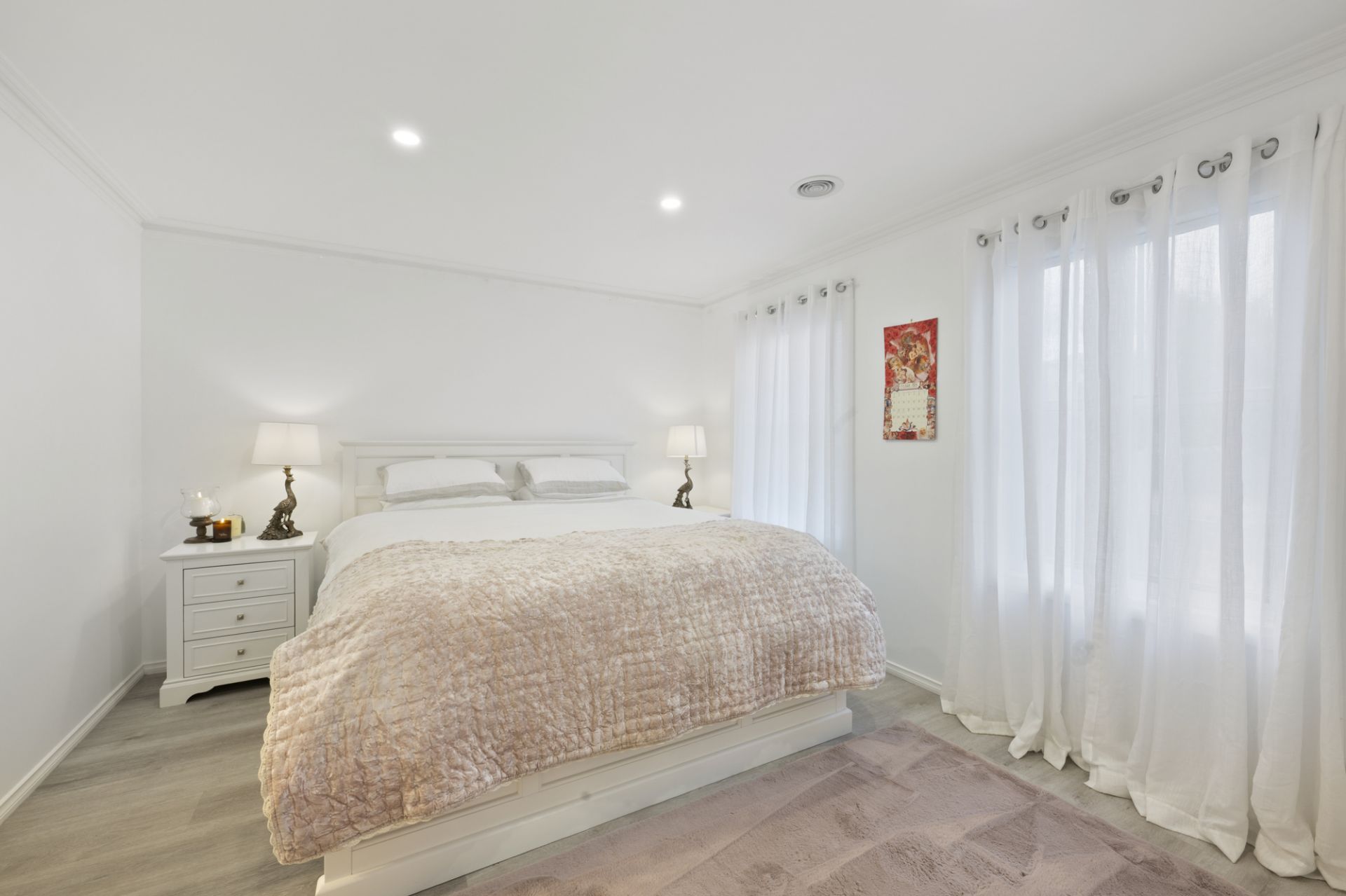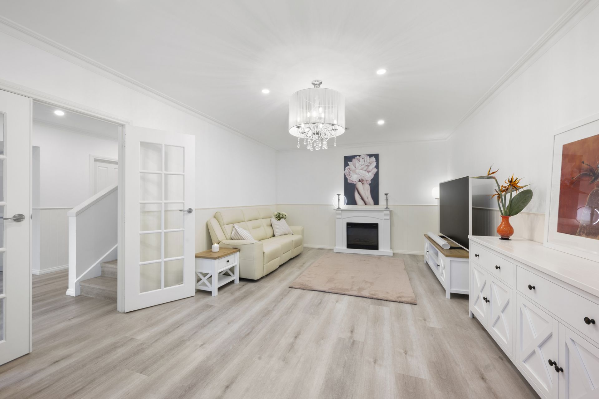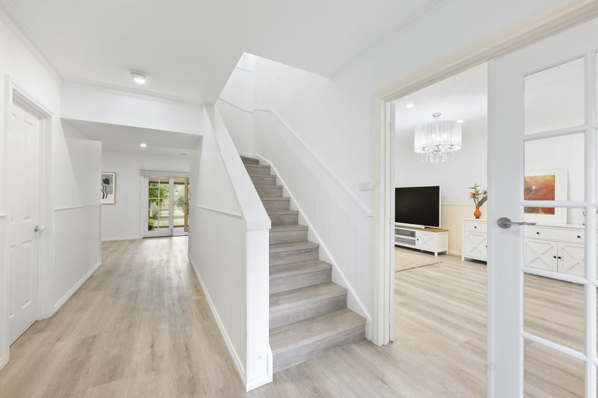 Freshly renovated and move-in ready, the home has been thoughtfully designed for contemporary family living, with multiple living zones, quality finishes and a warm, welcoming feel throughout. From the moment you enter, a striking staircase sets the tone, complemented by rich grey flooring, designer lighting, soft sheer curtains and an abundance of natural light that enhances the sense of space and calm.