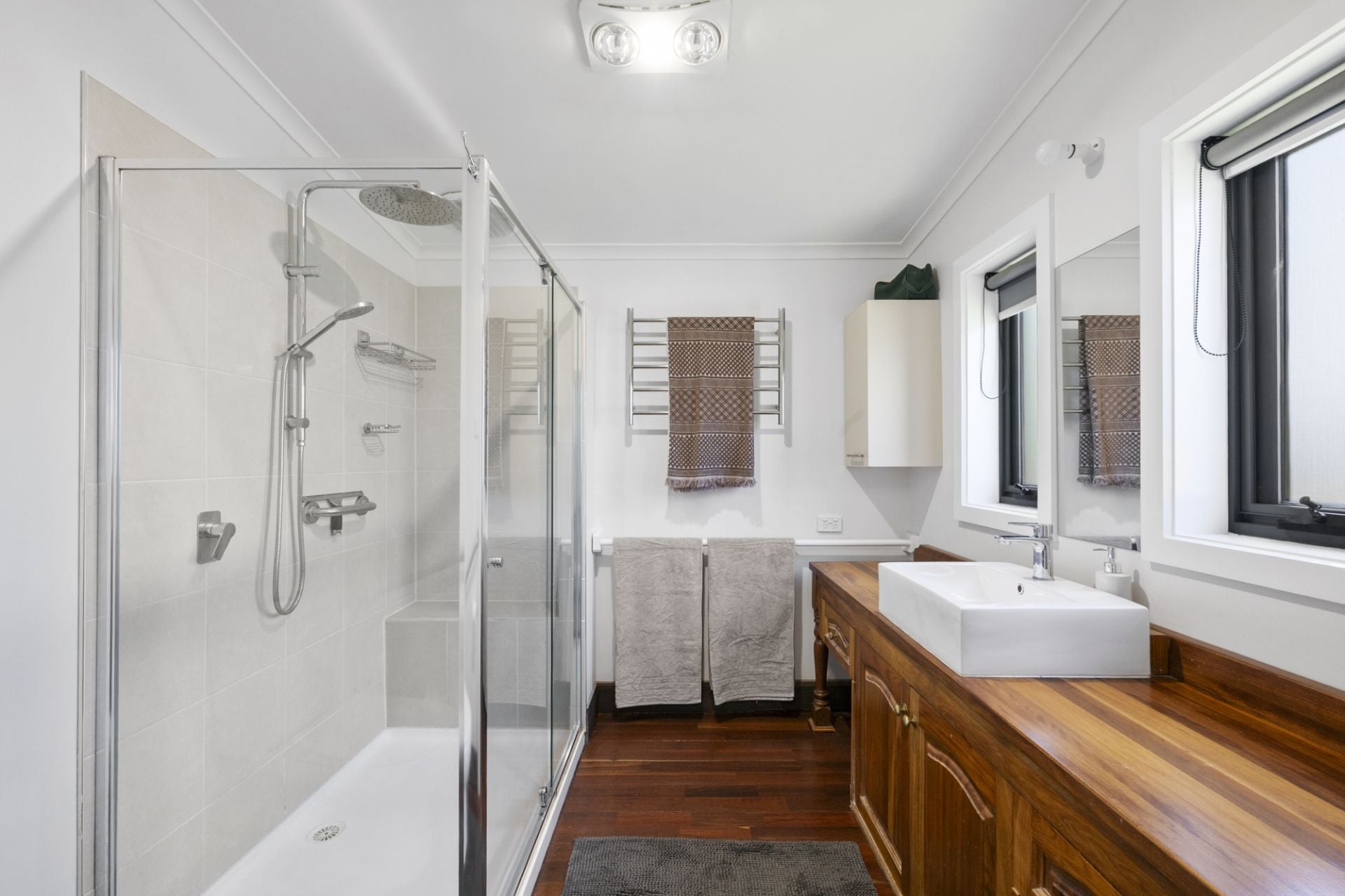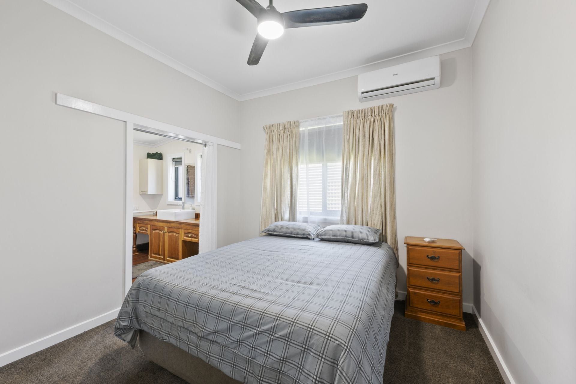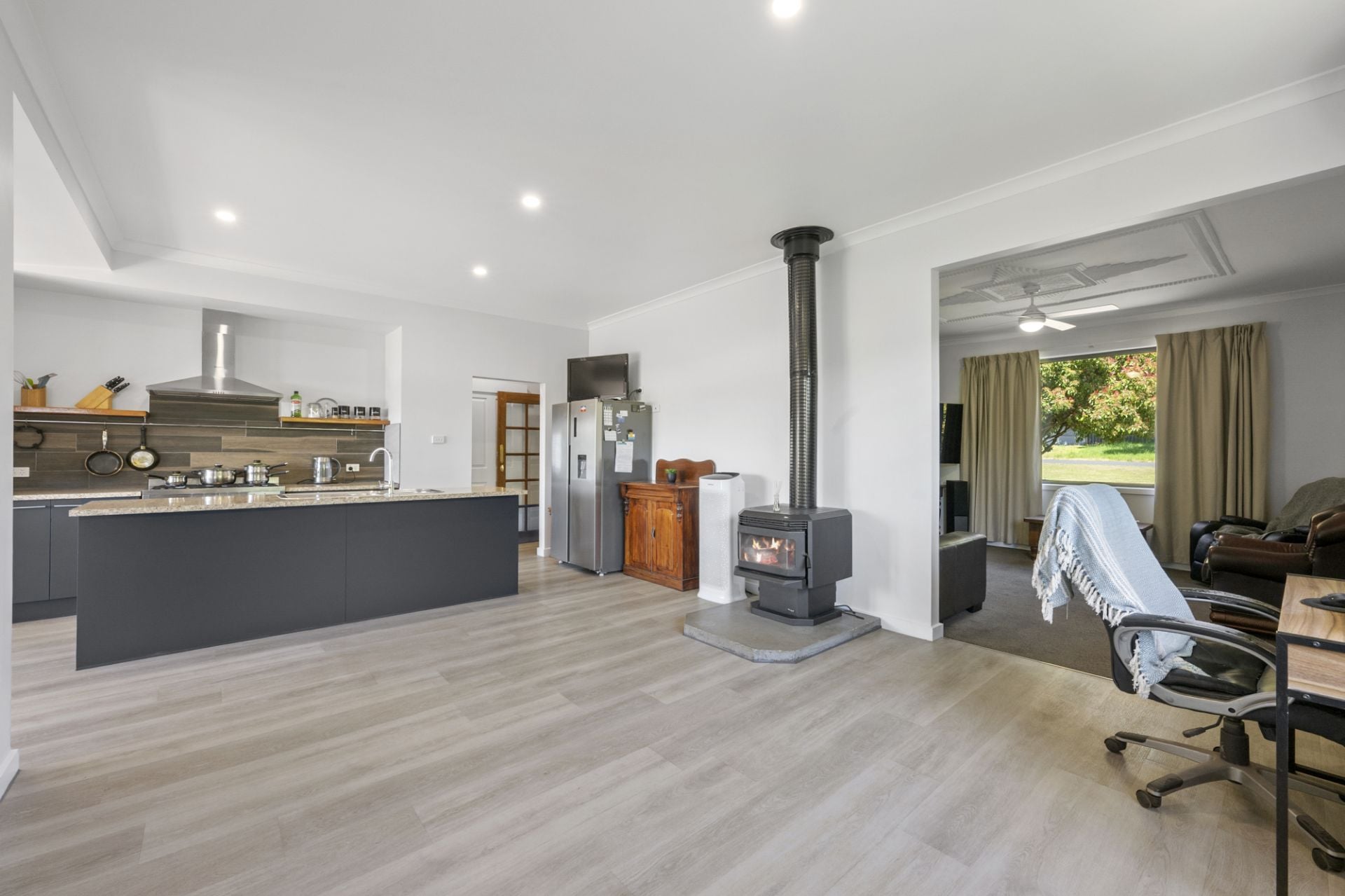 Comfort is assured with split-system heating and cooling in the master bedroom, along with a split system and cosy wood-fire heater in the dining area. Additional features include downlights throughout, dual street access, and secure single and two-car garages.