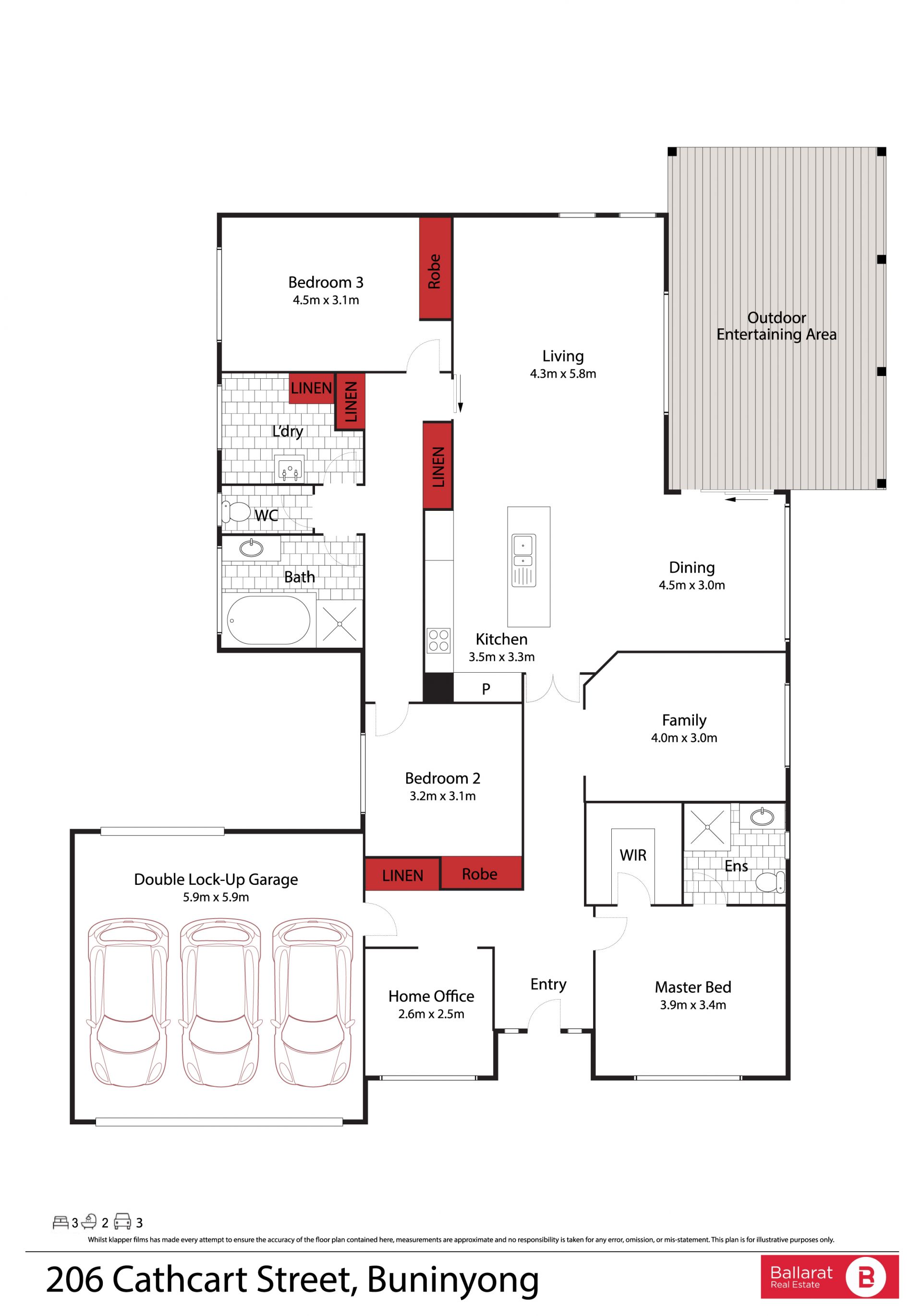 Set on a generous 800m² (approx.) block, this immaculate family home combines space, style and a prime Buninyong address. The master suite features a walk-in robe and ensuite, while two rear bedrooms with built-ins are serviced by a central bathroom. A front study offers flexibility as a fourth bedroom.