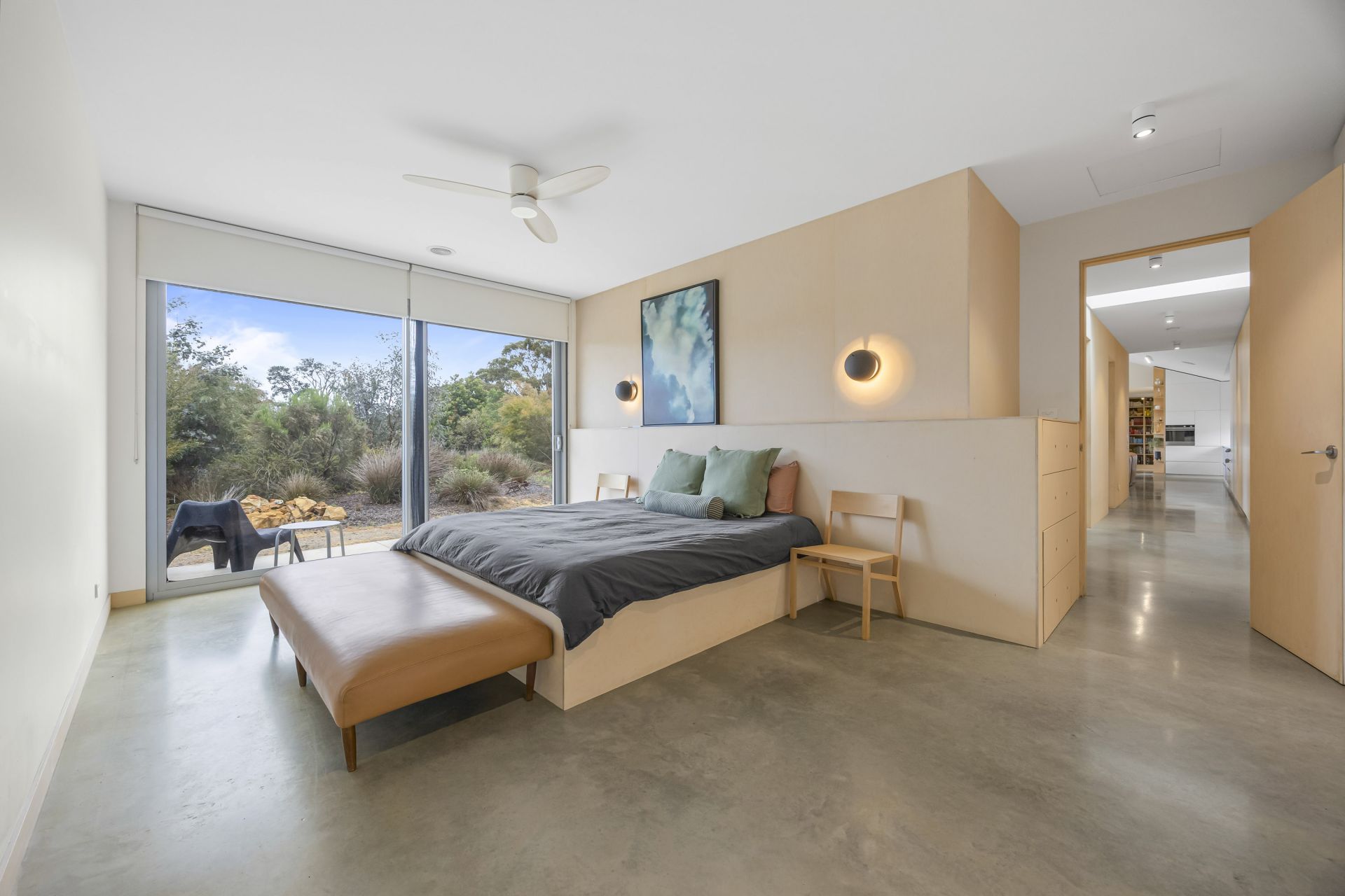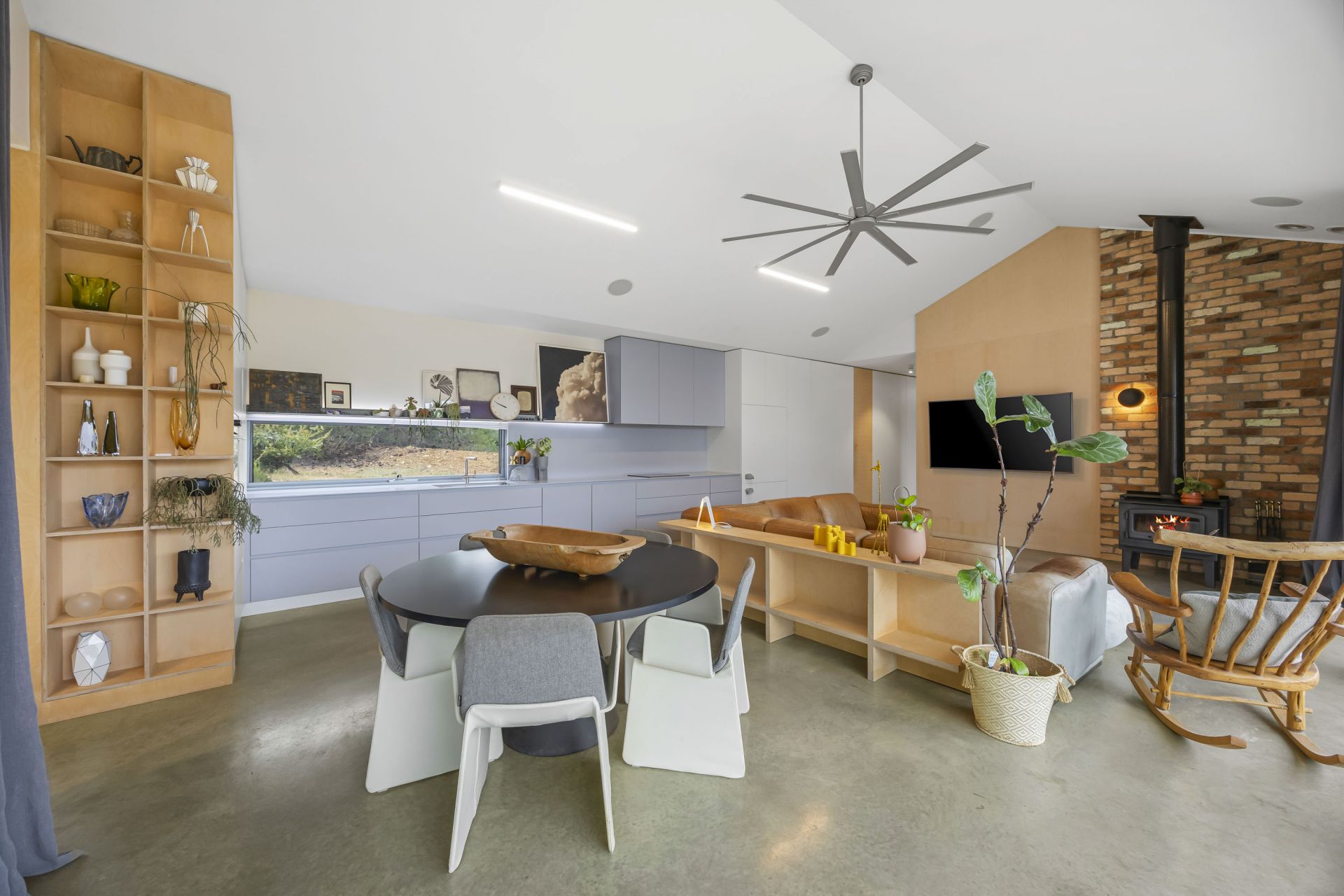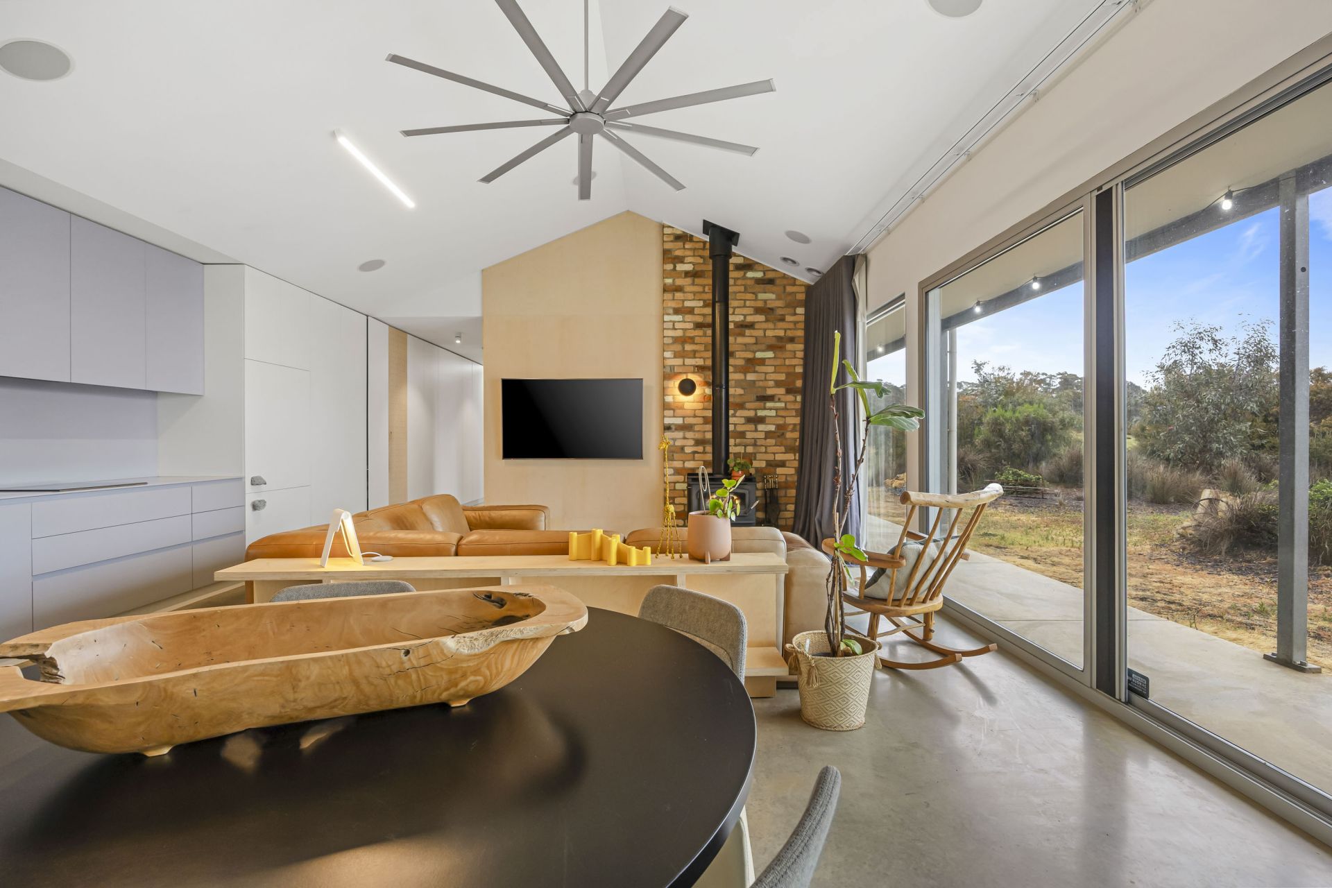The thoughtfully designed floorplan maximizes natural light and space, with clean contemporary lines, soaring ceilings, polished concrete flooring with waffle slab insulation throughout and expansive double glazed windows that frame the stunning rural outlook. The open-plan living and dining area flows seamlessly to a modern kitchen, creating an inviting hub for family life and entertaining with an abundance of cupboard and storage space throughout the home.