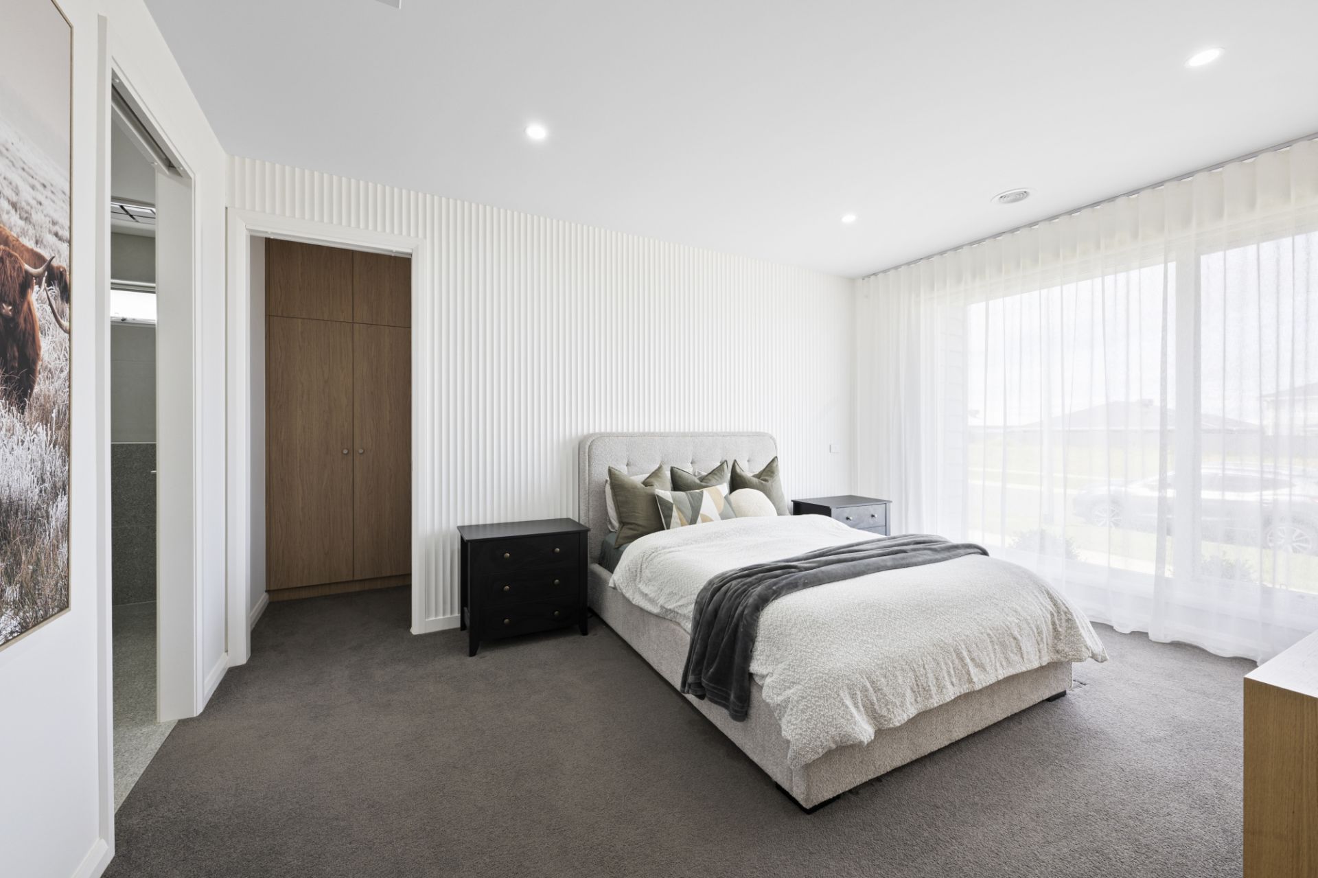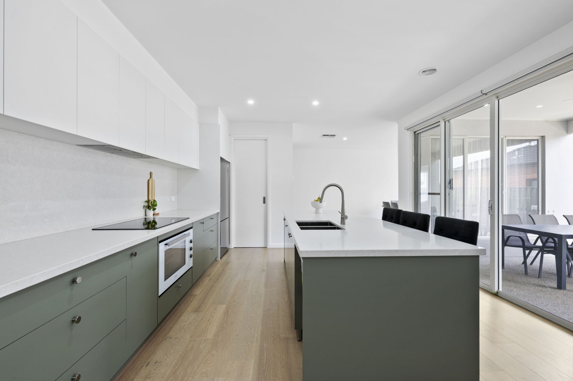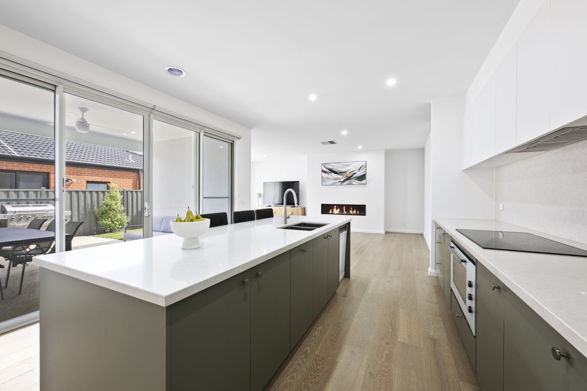 The beautifully appointed kitchen is sure to delight, featuring stone benchtops, an easy-to-clean induction cooktop, soft-closing cabinetry and a large walk-in pantry. The private master suite boasts a walk-in robe and a luxurious ensuite complete with a dual vanity with timber benchtops, a walk-in shower and a secluded toilet. The main bathroom reflects the same contemporary elegance, offering a walk-in shower, a soaking bathtub and a feature basin set on timber benchtops.