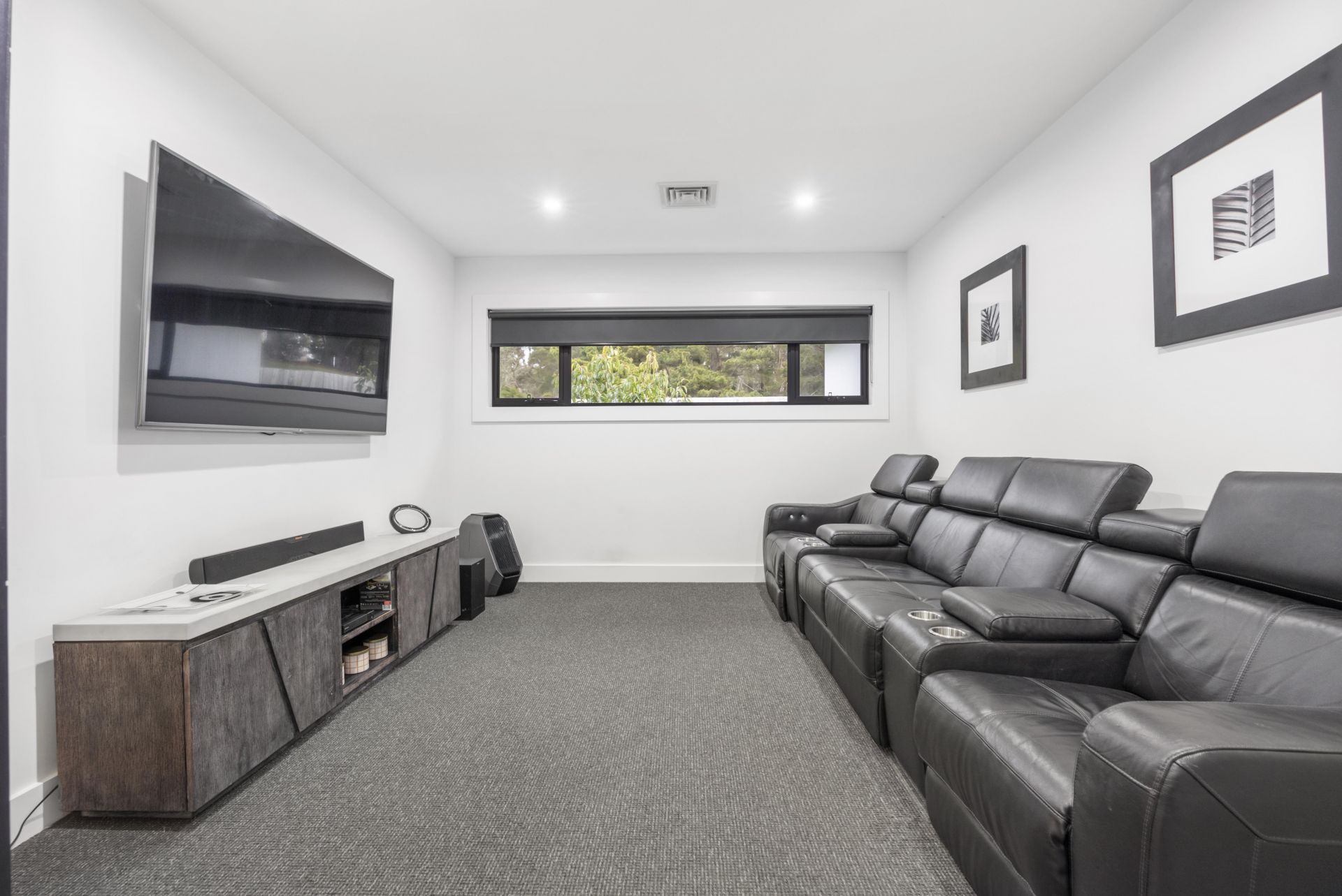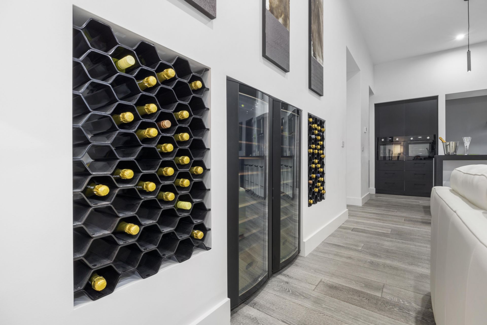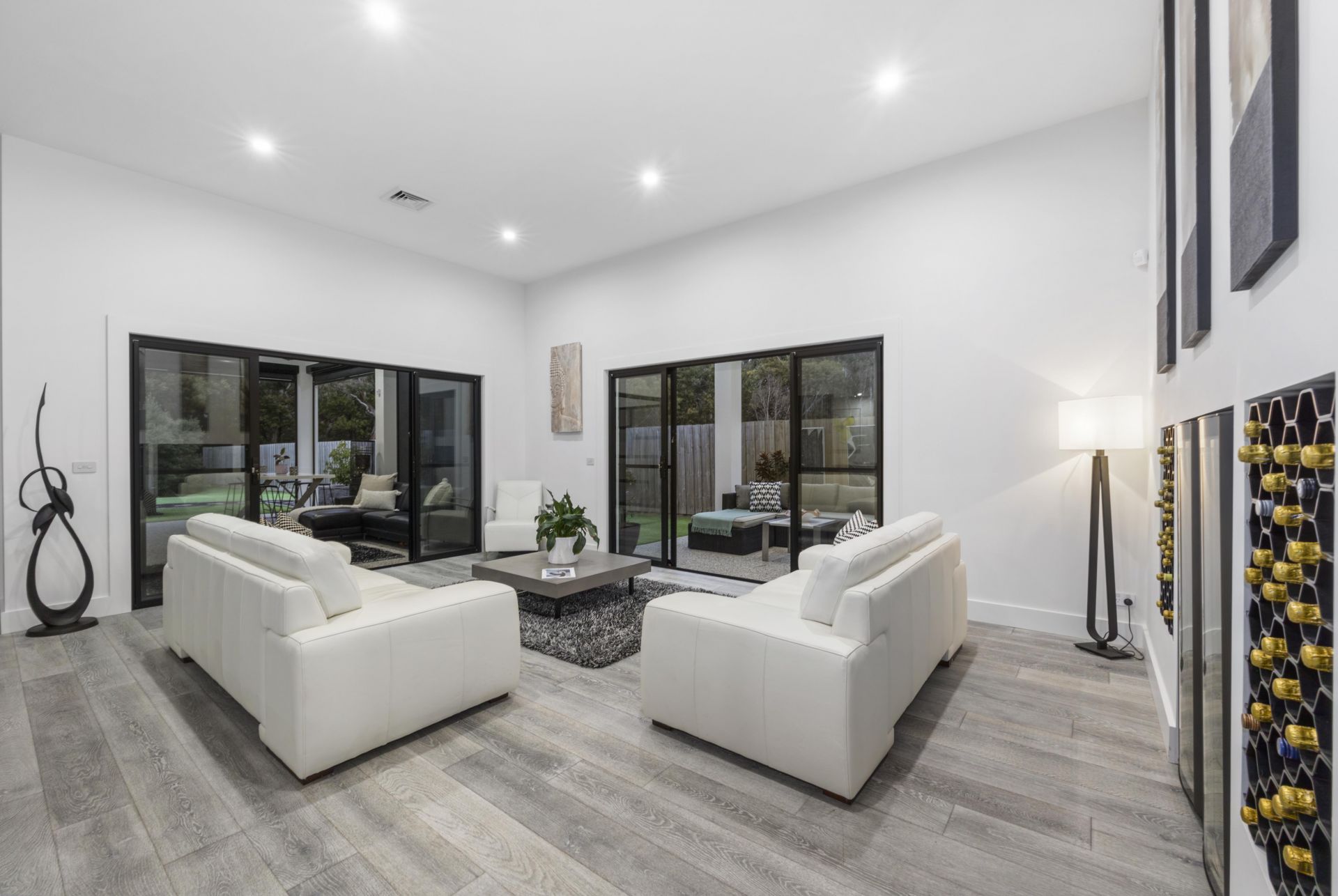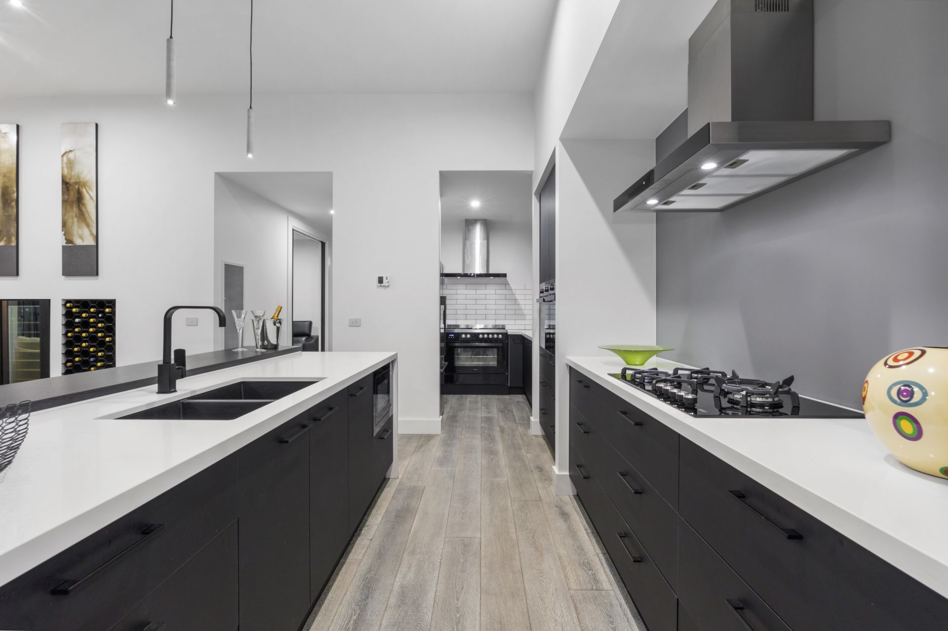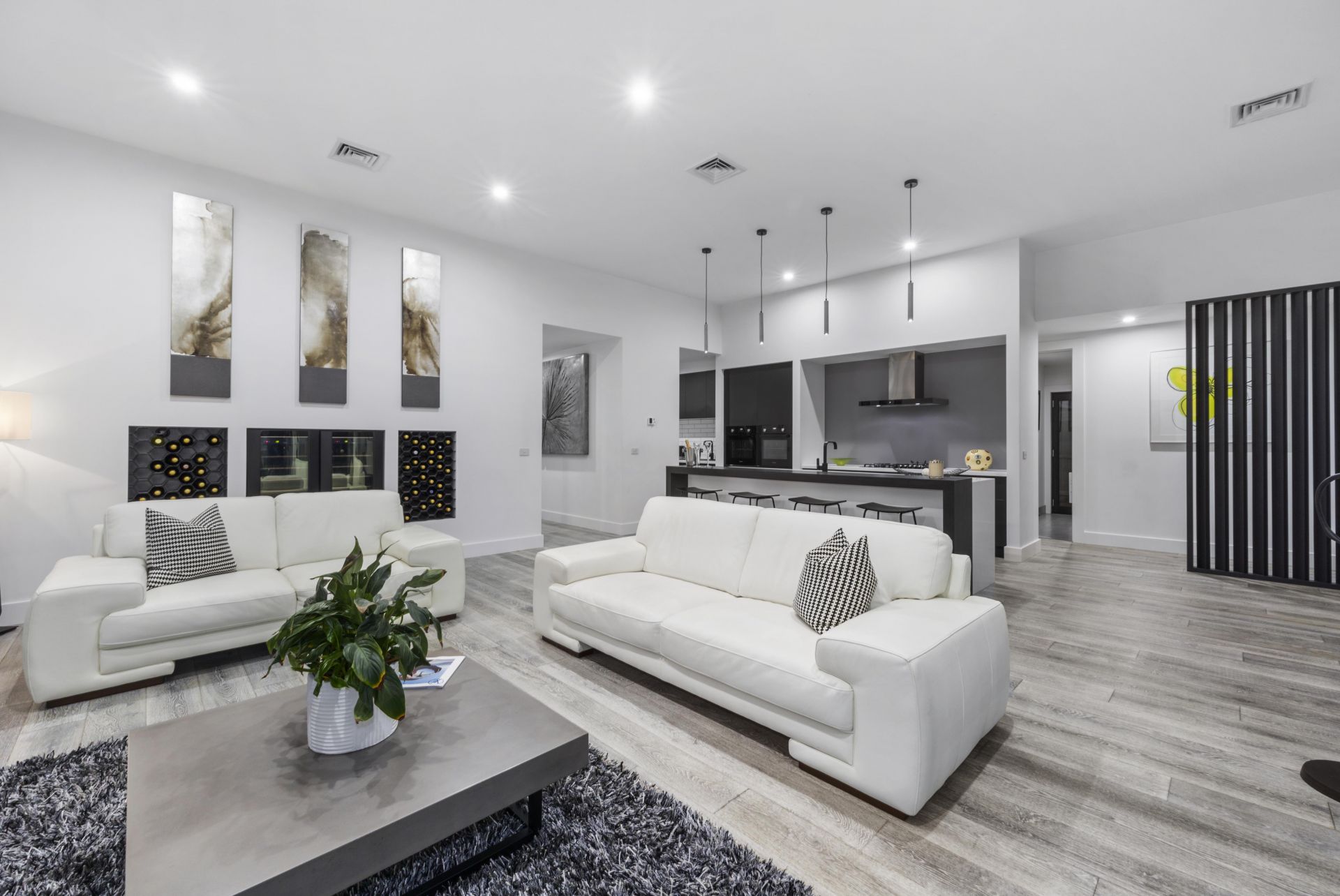 With three separate living zones-including a formal lounge, open-plan family space, and a rear rumpus room-there's room for everyone. The designer kitchen boasts Caesarstone benchtops, waterfall breakfast bar, matte black custom cabinetry, two integrated ovens, a butler's pantry with 900mm freestanding oven and dishwasher, plus custom wine racks and dual chillers.