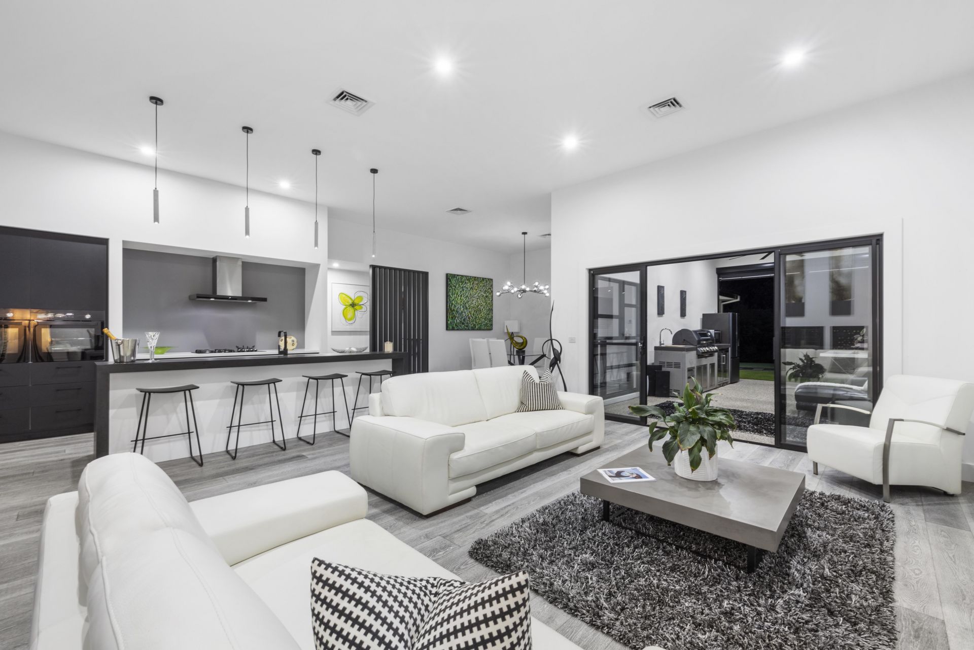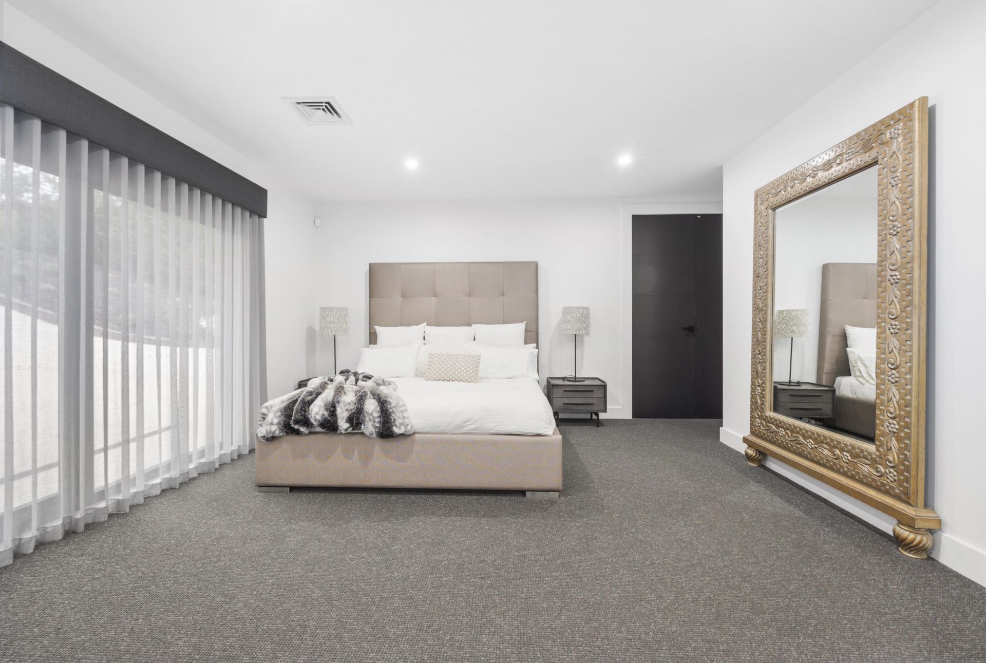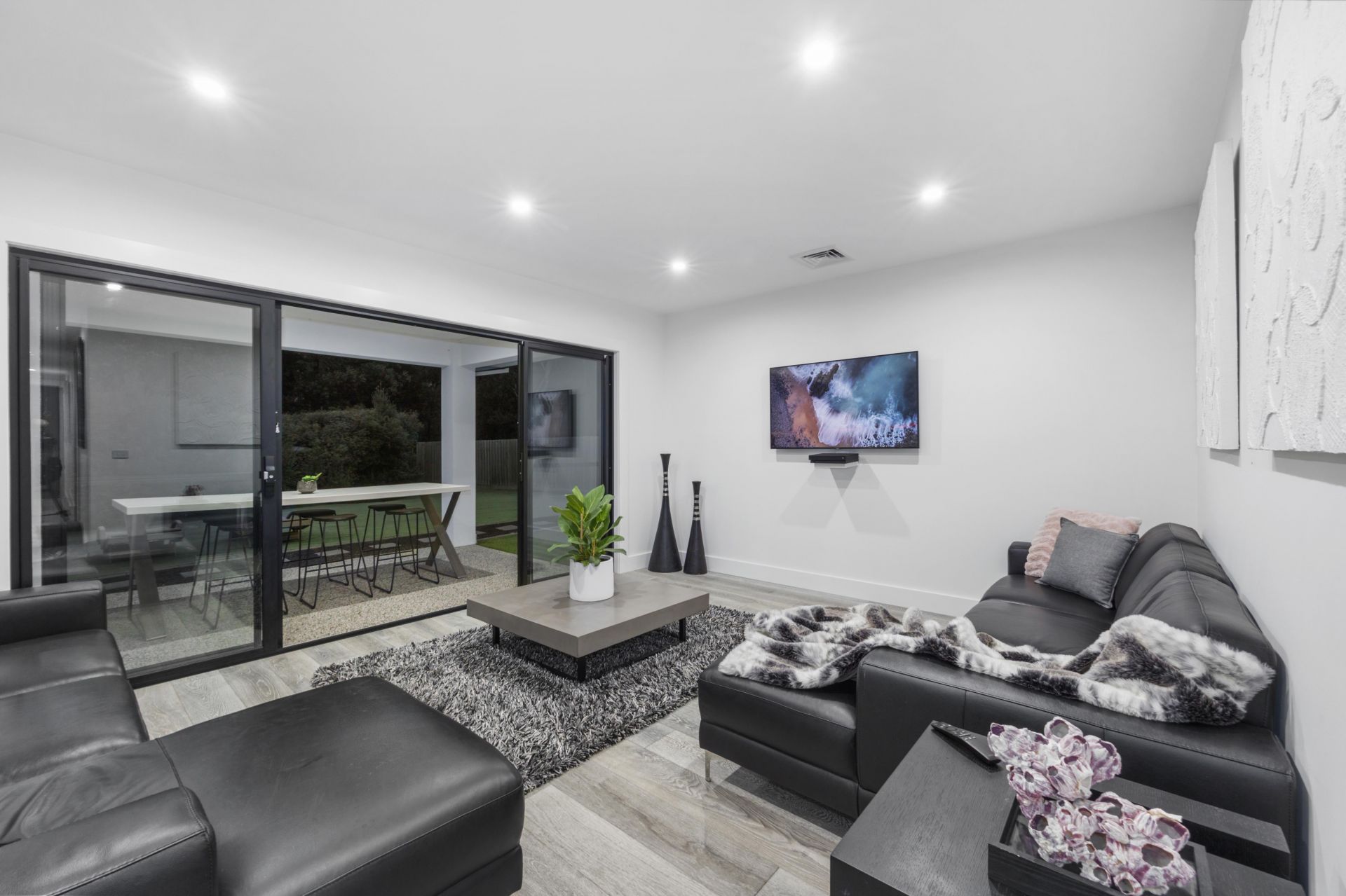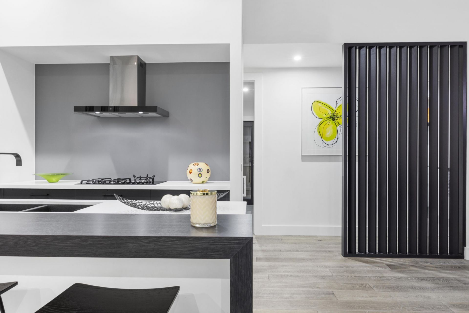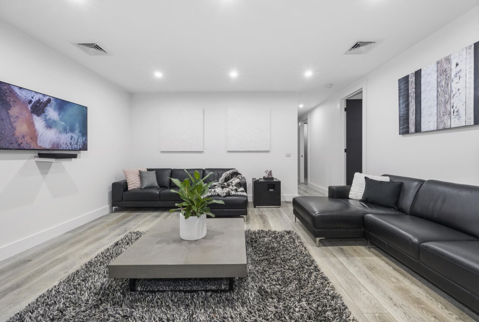 With three separate living zones-including a formal lounge, open-plan family space, and a rear rumpus room-there's room for everyone. The designer kitchen boasts Caesarstone benchtops, waterfall breakfast bar, matte black custom cabinetry, two integrated ovens, a butler's pantry with 900mm freestanding oven and dishwasher, plus custom wine racks and dual chillers.