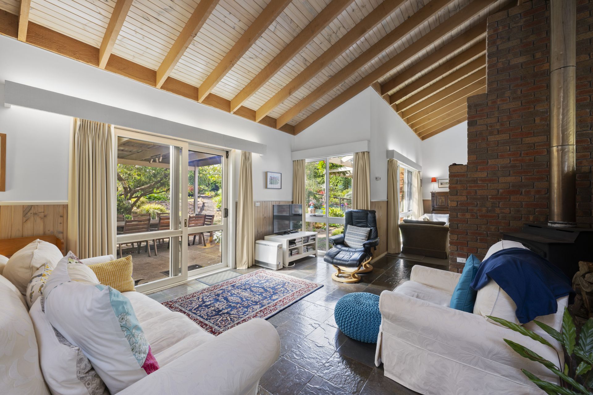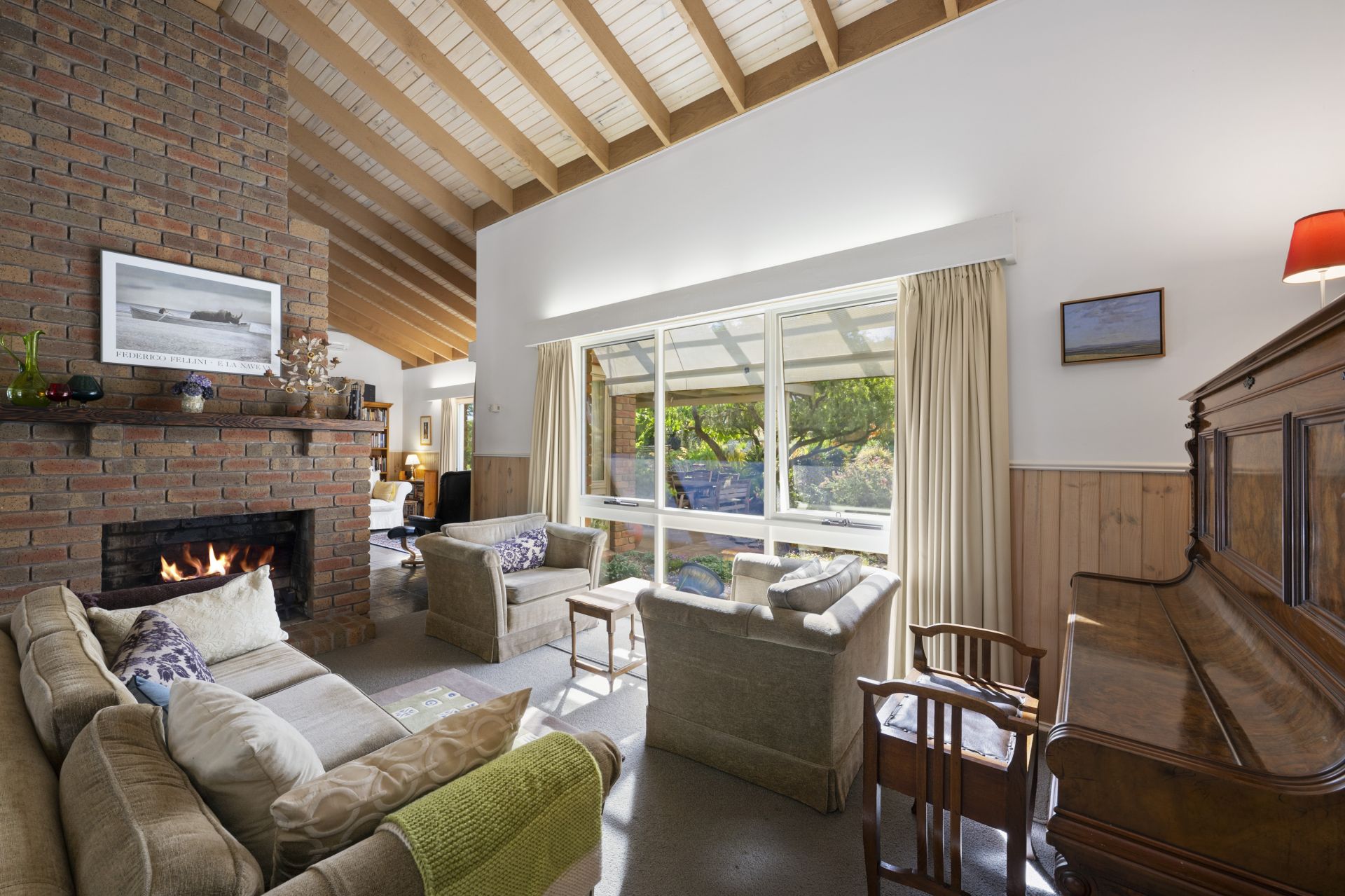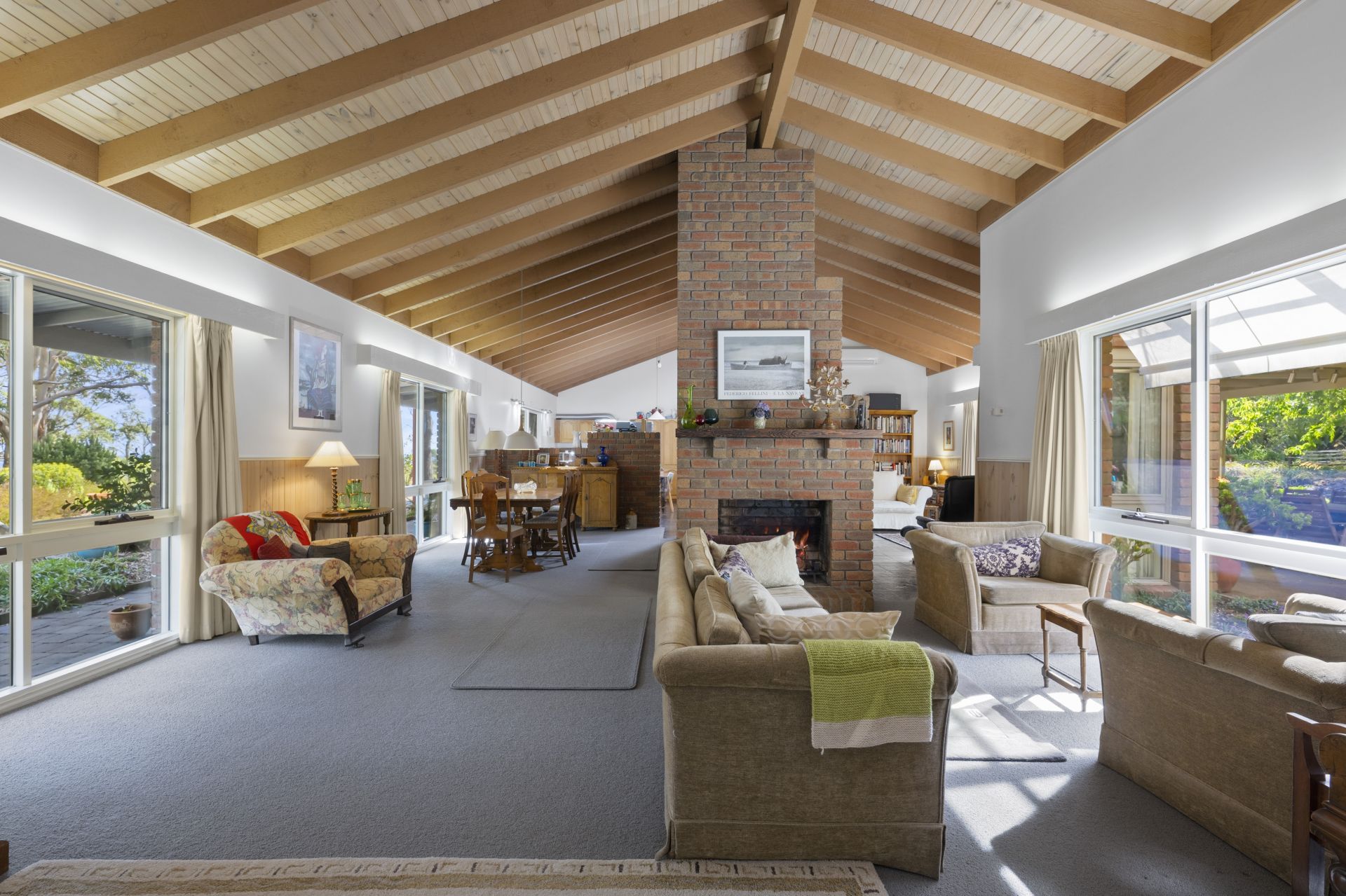 At the heart of the home is a dual living zone with high ceilings, separated by an open fireplace and a wood-burning combustion heater, perfect for cozy gatherings year-round. A generous dining area flows into the light-filled kitchen, which has extensive storage. This area is surrounded by expansive windows framing the landscape and garden views.