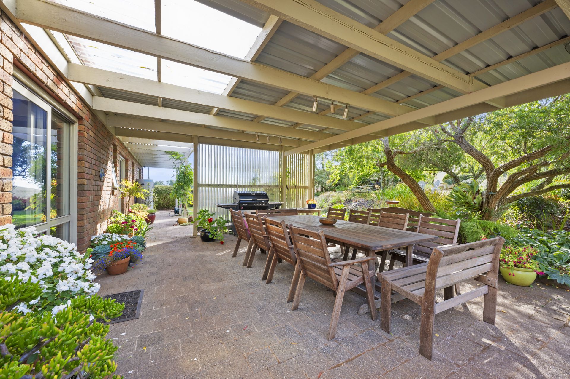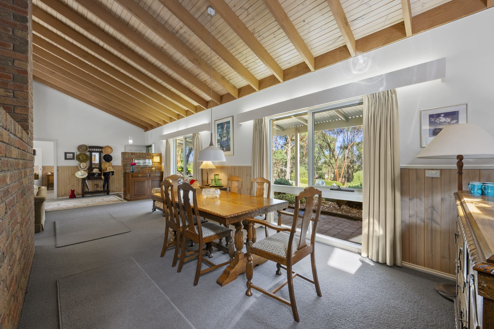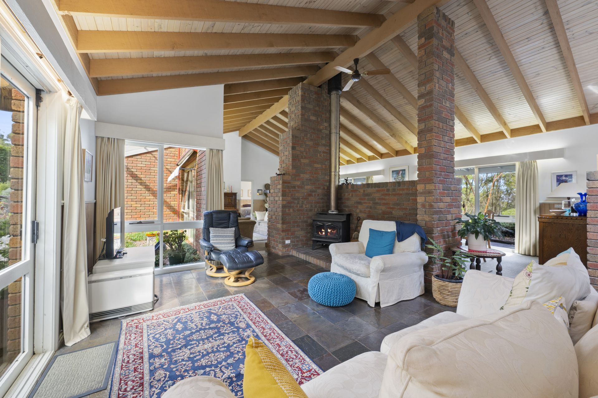 At the heart of the home is a dual living zone with high ceilings, separated by an open fireplace and a wood-burning combustion heater, perfect for cozy gatherings year-round. A generous dining area flows into the light-filled kitchen, which has extensive storage. This area is surrounded by expansive windows framing the landscape and garden views.