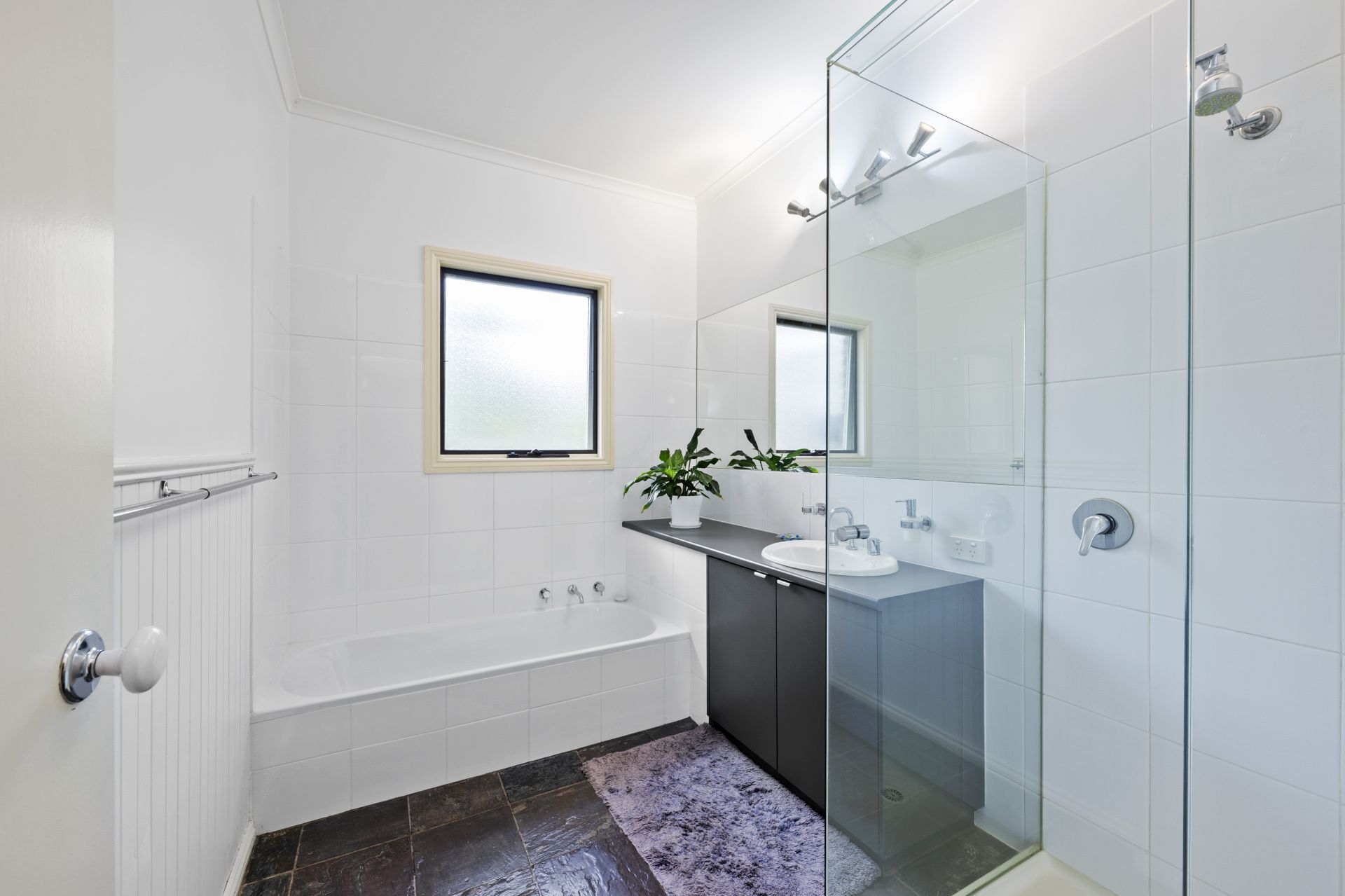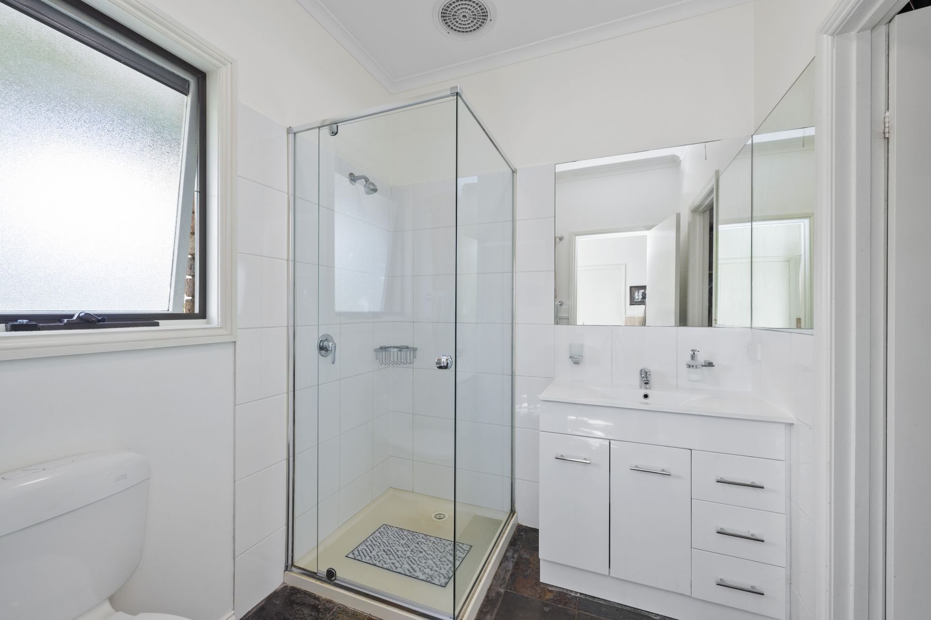 Designed with comfort and character, the home features modern updates blended with classic appeal. The spacious master bedroom includes a walk-through robe and a well-appointed ensuite with slate flooring, which can be shared with the adjacent bedroom for added versatility. All other bedrooms offer built-in robes. The central bathroom, which has a slate floor, includes both a bath and separate shower.