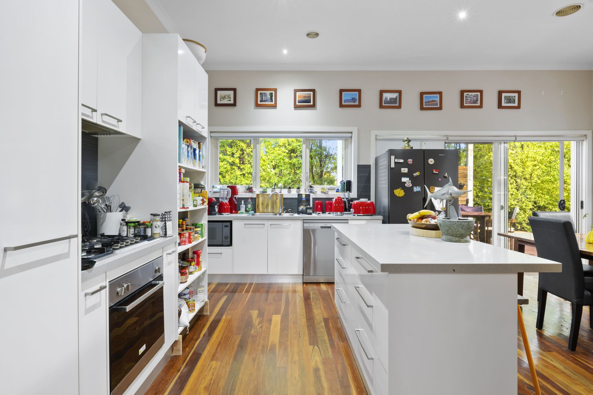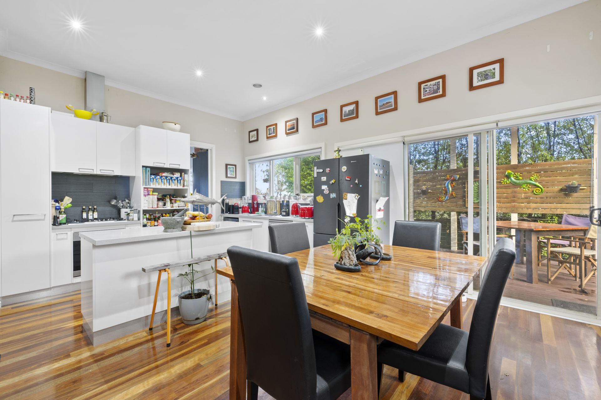 At the heart of the home is a light-filled open-plan living, kitchen and dining area, with wide glass doors connecting seamlessly to a covered entertaining deck. The kitchen is both stylish and functional, featuring an island bench, stone benchtops and quality stainless steel appliances.