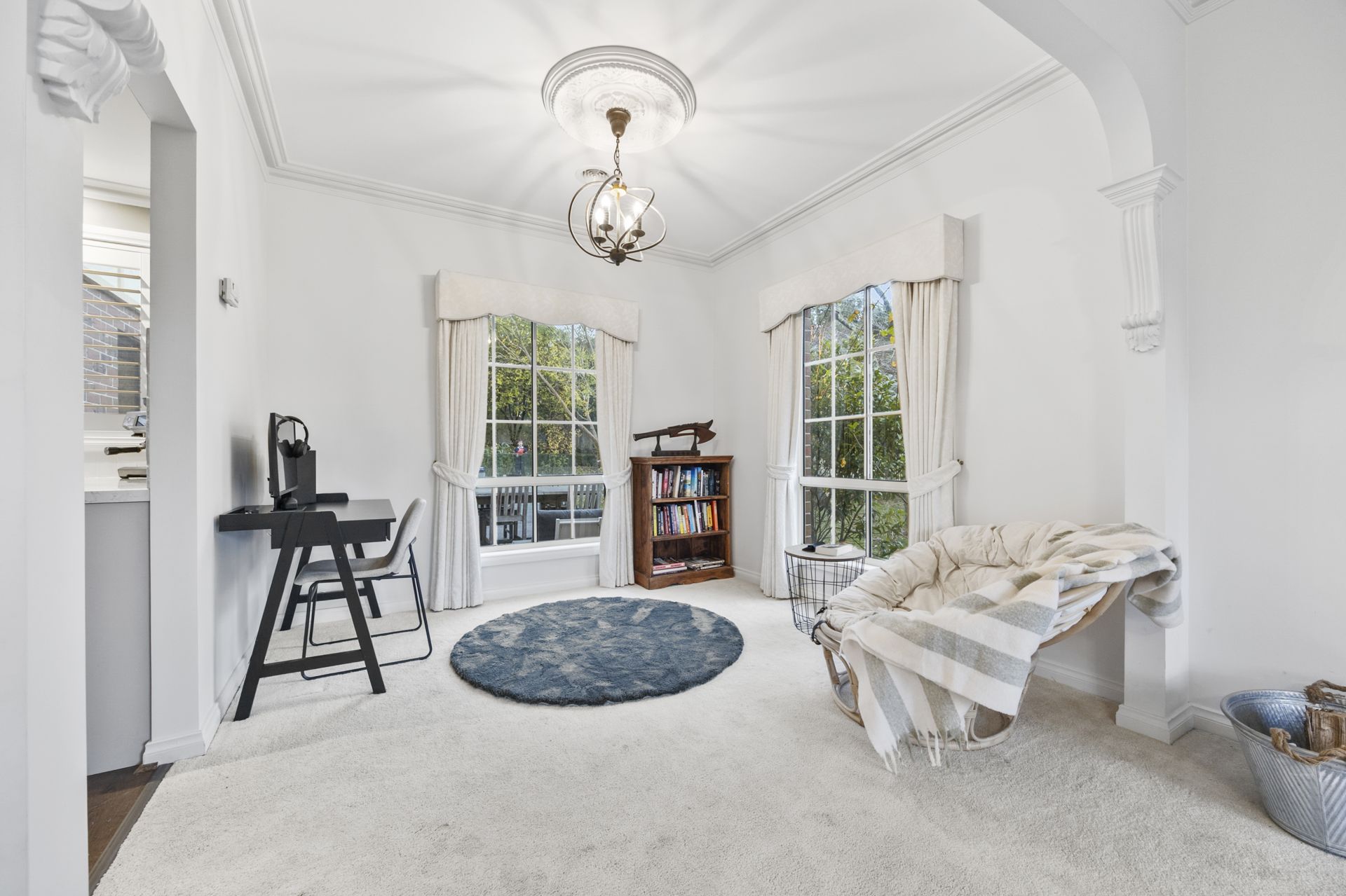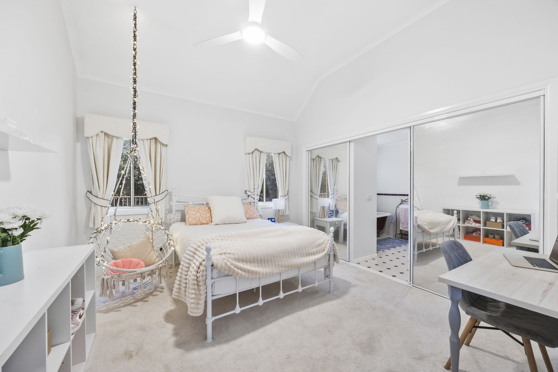 Inside, soaring ceilings, ornate plasterwork, and thoughtful storage create a sense of understated luxury. The flexible floorplan offers up to four spacious bedrooms, including an upstairs master retreat complete with walk-in robe, ensuite, and private lounge. Alternatively, a downstairs suite-with its own ensuite and elegant clawfoot bath-provides the perfect haven for guests or teenagers. The main bathroom has been stylishly updated, blending modern finishes with timeless appeal.