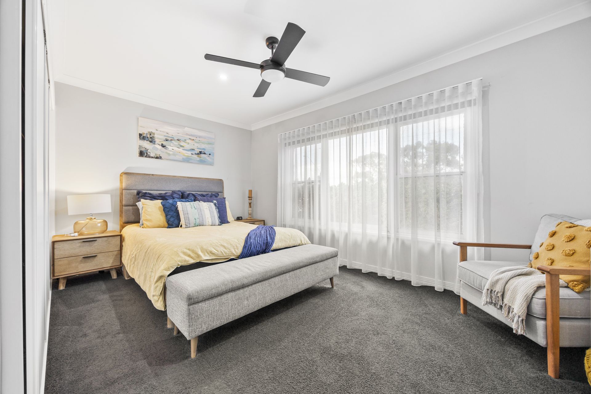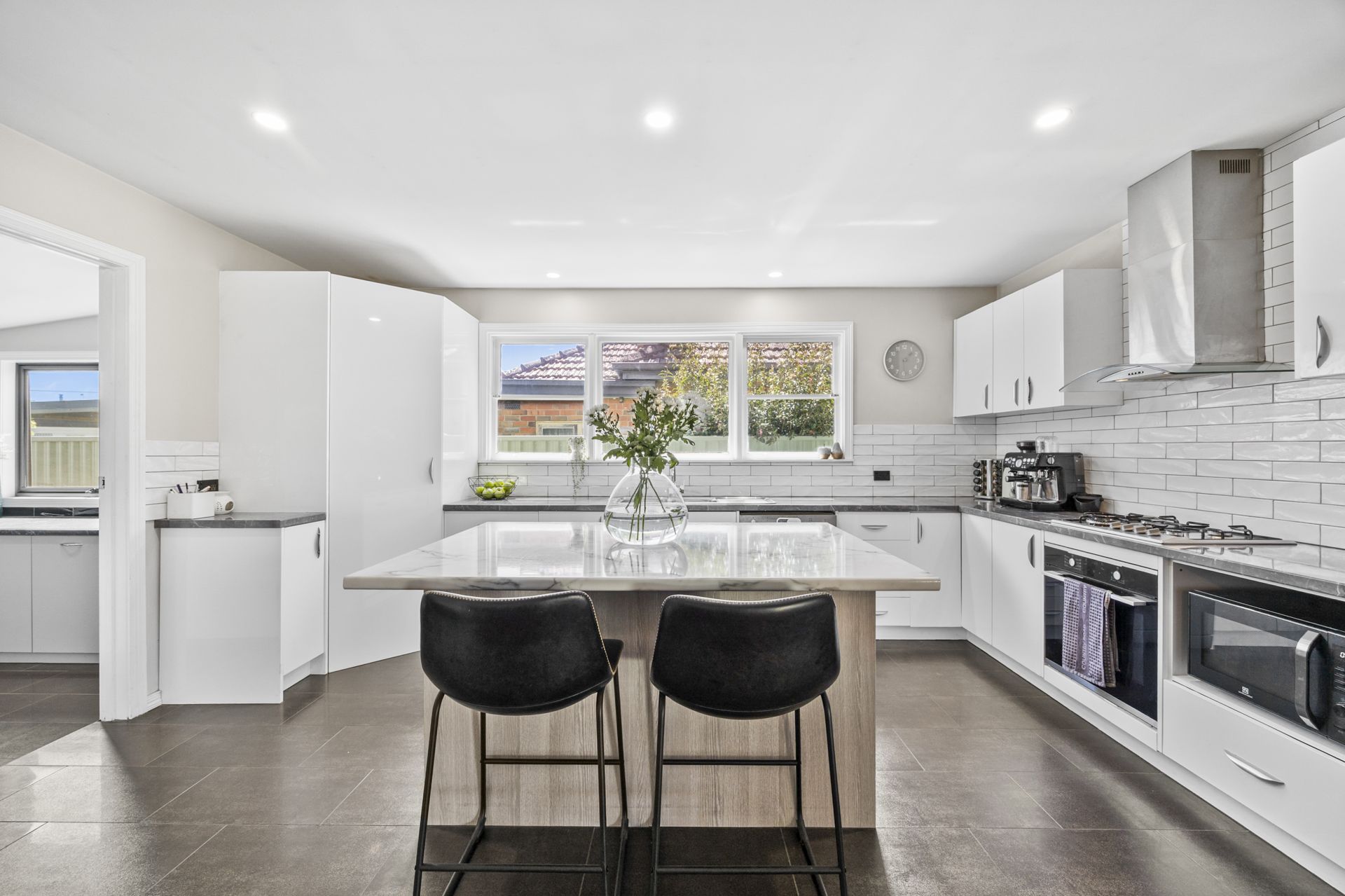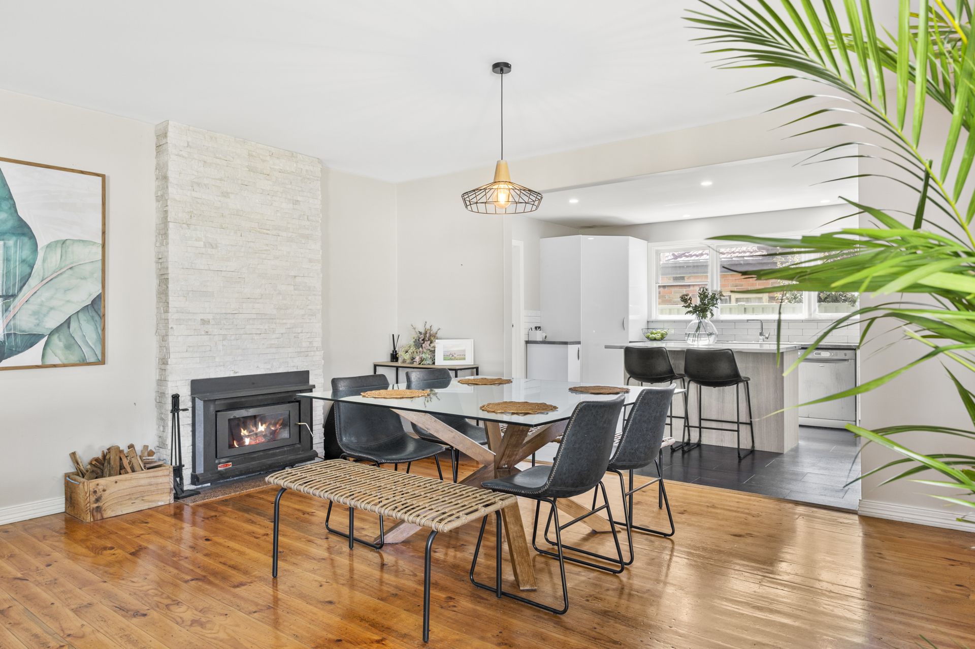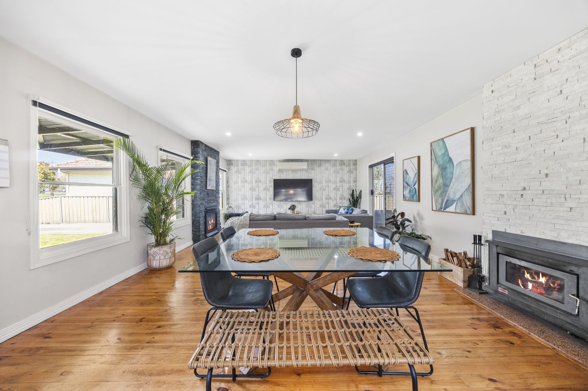 Step inside to discover light-filled bedrooms, a stunning family bathroom and original polished floorboards leading to a generous open-plan living zone. The stylish kitchen features stainless steel appliances, soft-closing drawers and quality joinery, while the adjoining dining and living areas are kept cosy year-round with a gas log fire, wood heater and split-system cooling.