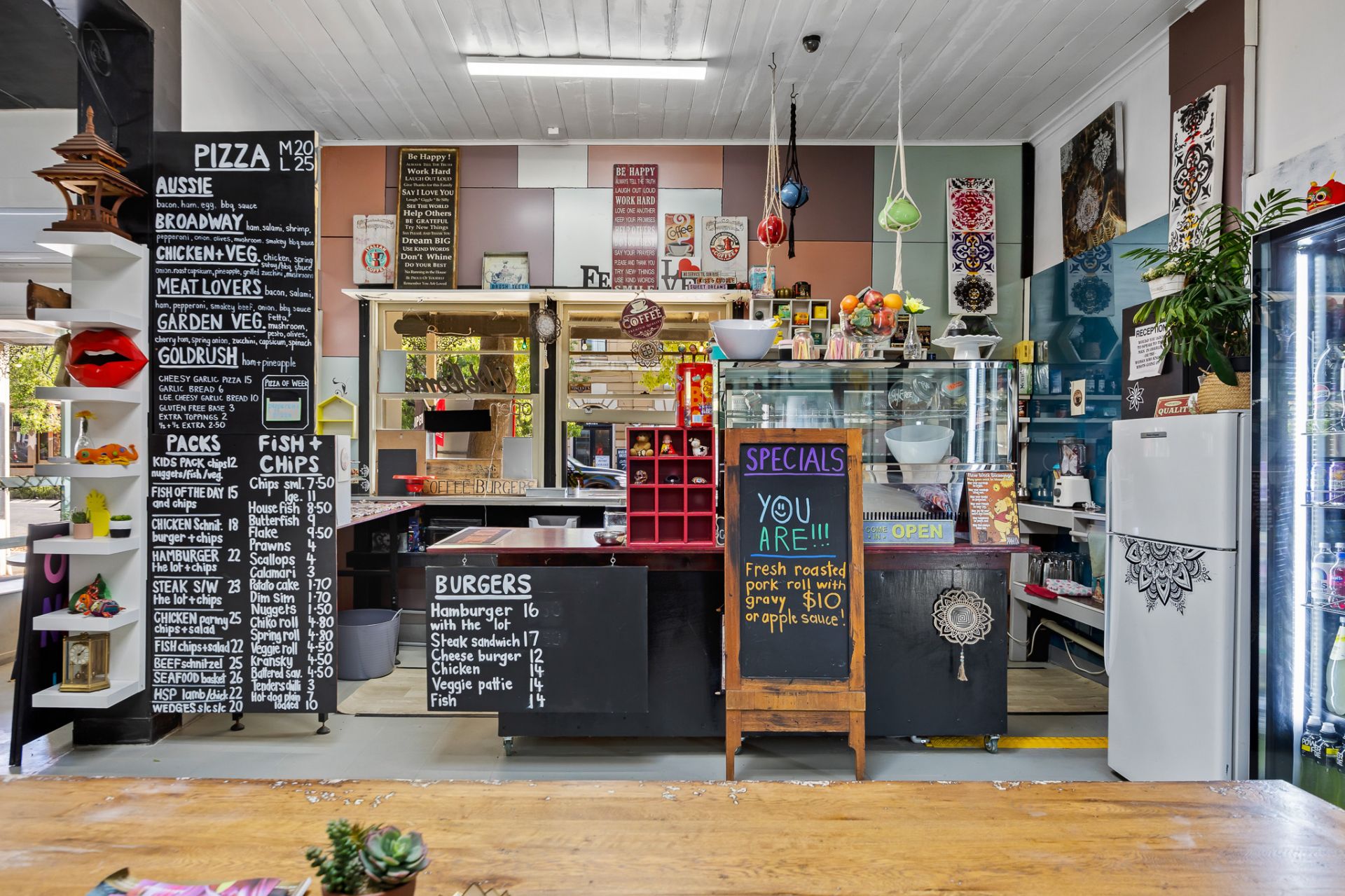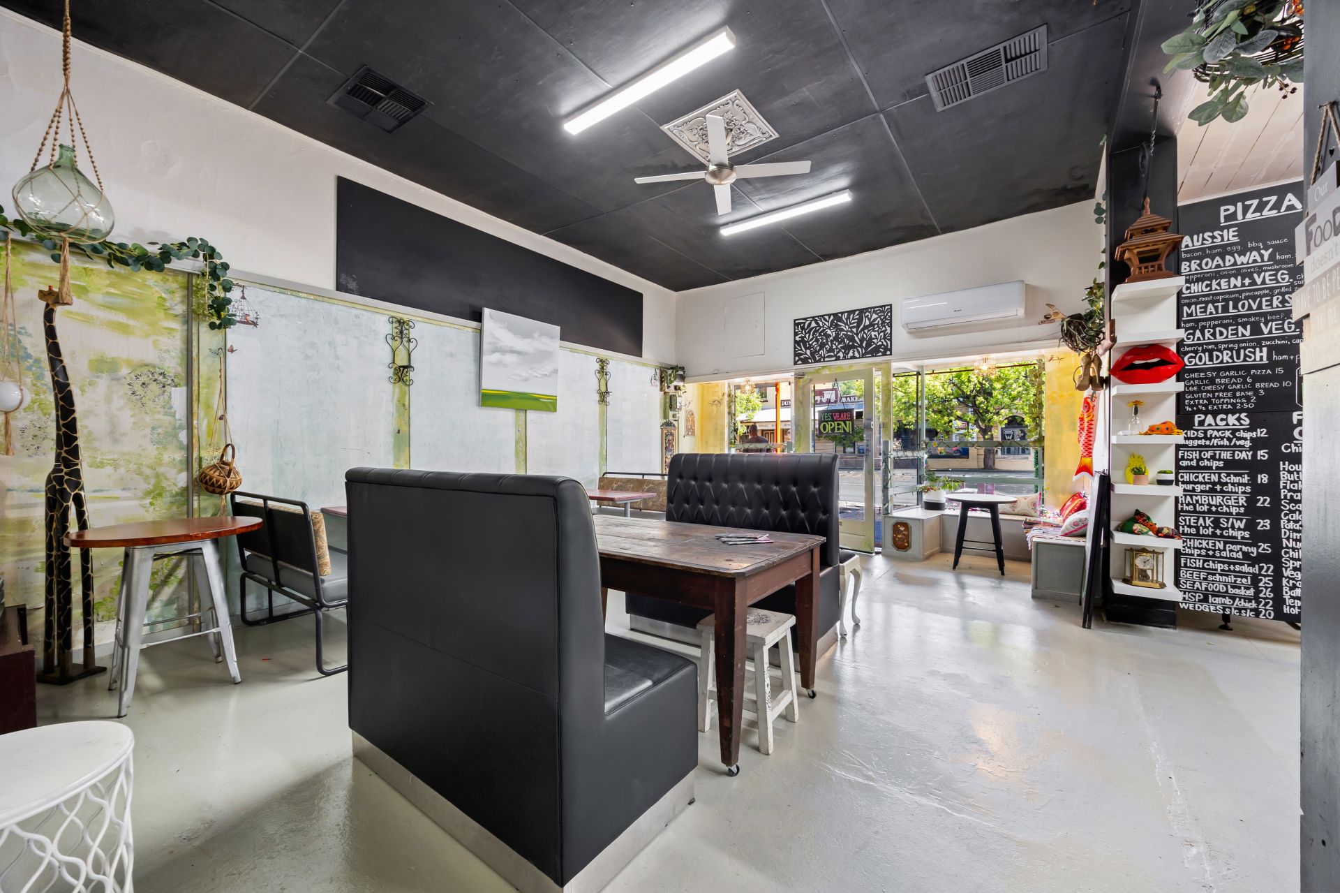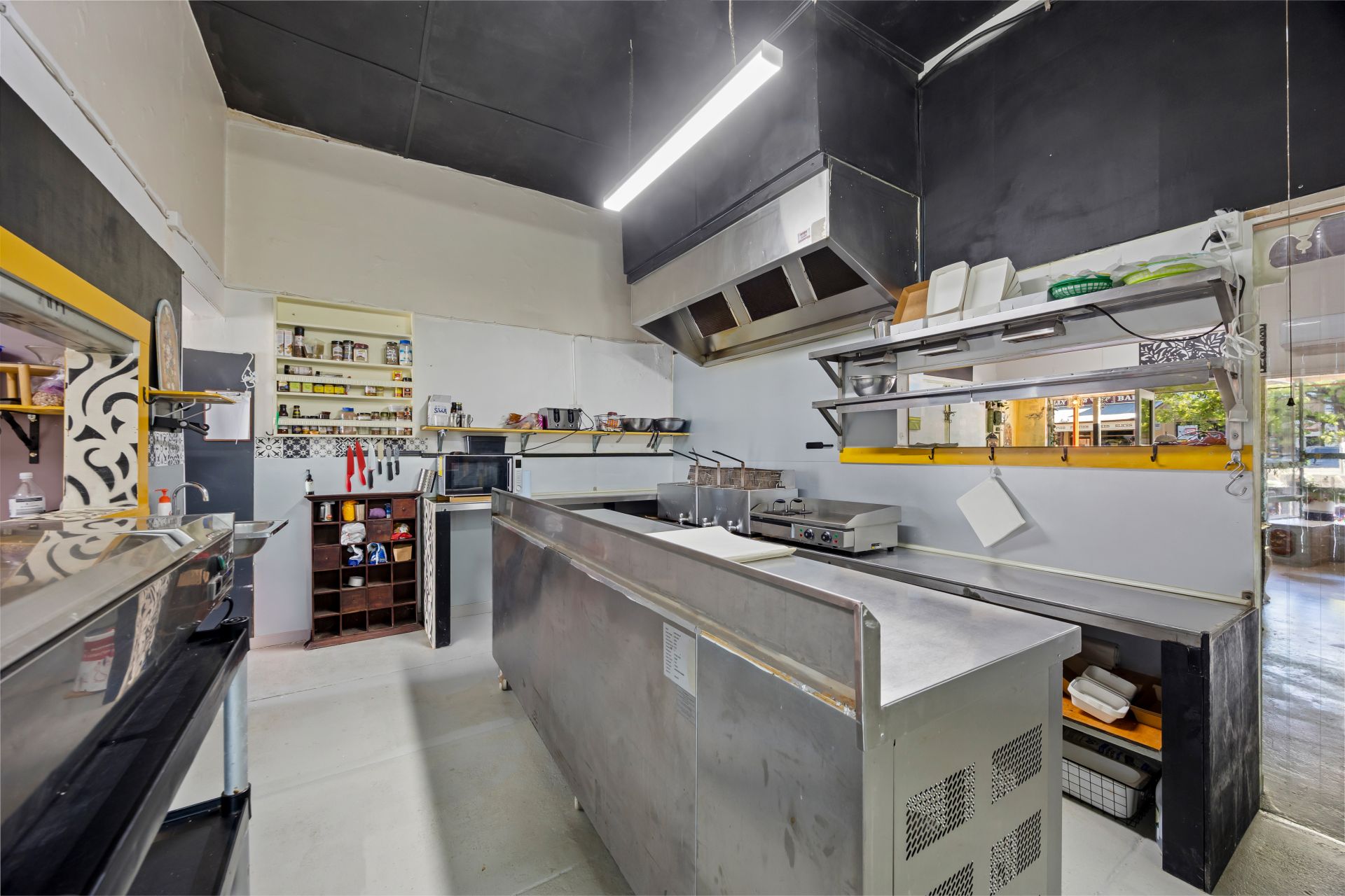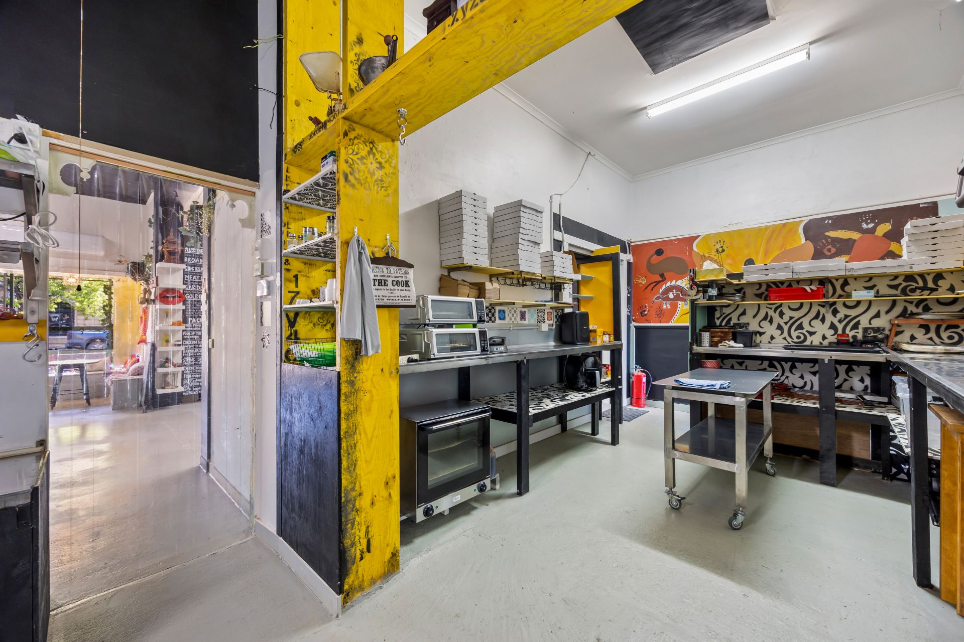 music. The large street-facing shopfront features expansive display windows and a welcoming coffee nook opening directly onto Broadway. Inside, the space is thoughtfully designed to support multiple dining experiences, with both front and rear areas set up for day and night trading. At the heart of the business is a fully equipped, stainless-steel, chef-designed commercial kitchen. Currently operating as a daytime cafe with popular fish & chip and pizza nights, the venue is